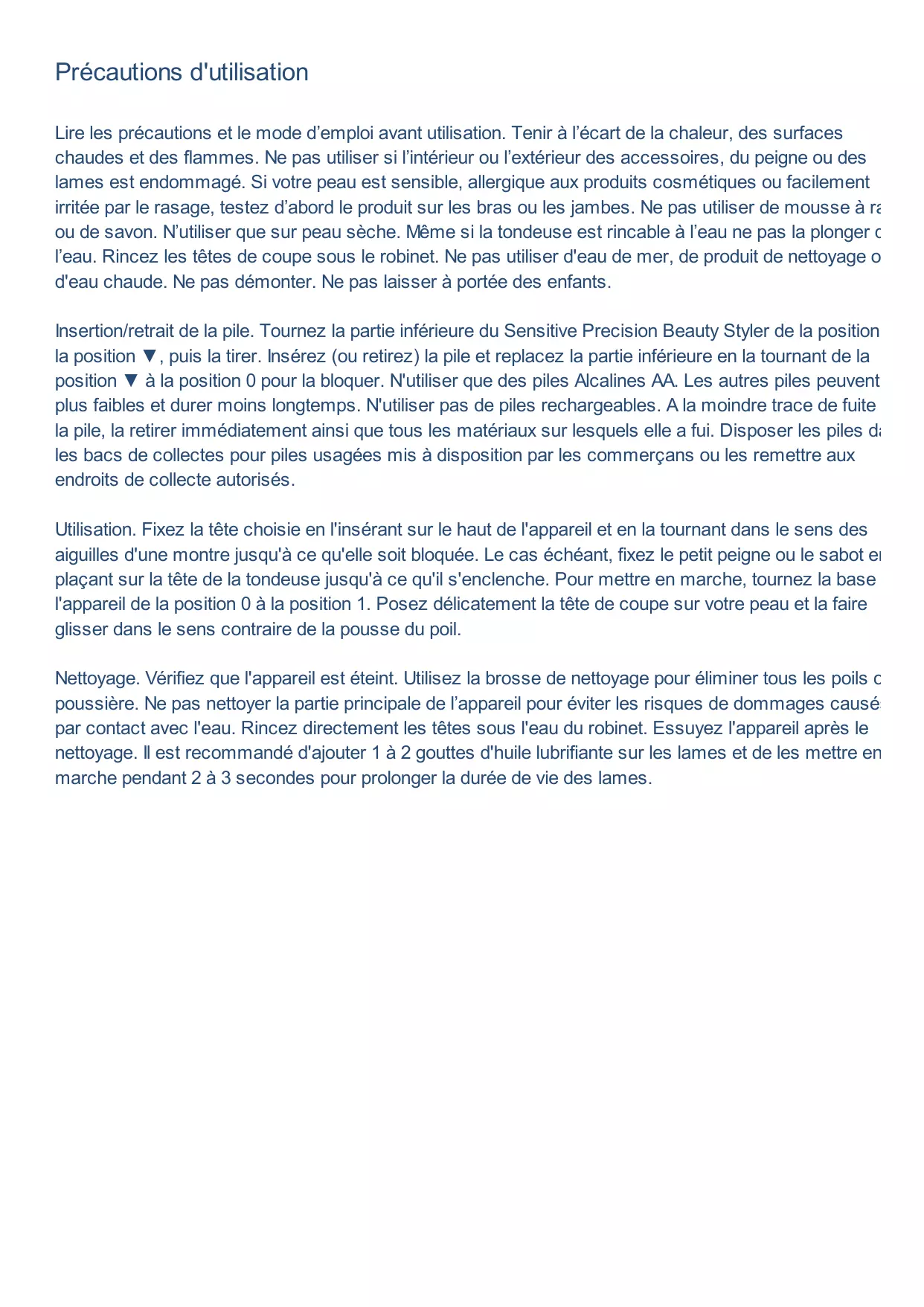 Lire les précautions et le mode d'emploi avant utilisation. Tenir à l'écart de la chaleur, des surfaces chaudes et des flammes. Ne pas utiliser si l'intérieur ou l'extérieur des accessoires, du peigne ou des lames est endommagé. Si votre peau est sensible, allergique aux produits cosmétiques ou facilement irritée par le rasage, testez d'abord le produit sur les bras ou les jambes. Ne pas utiliser de mousse à raser ou de savon. N'utiliser que sur peau sèche. Mettez si la tondeuse est rincable à l'eau ne pas la plonger dans l'eau. Rincez les têtes de coupe sous le robinet. Ne pas utiliser d'eau de mer, de produit de nettoyage ou d'eau chaude. Ne pas démonter. Ne pas laisser à portée des enfants.