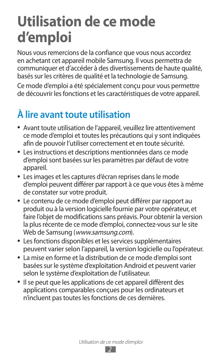 Les applications et leurs fonctions peuvent varier selon votre zone géographique ou les caractéristiques du matériel. Samsung ne peut être tenu responsable des problèmes de performance relatifs aux applications fournies par des tiers. ●● Samsung ne peut être tenu responsable des problèmes de performance ou des incompatibilités découlant de la modification par l’utilisateur du logiciel du système d’exploitation ou des paramètres de registre. Toute tentative de personnalisation du système d’exploitation peut entraîner des dysfonctionnements de votre appareil ou de ses applications. ●● Vous pouvez mettre à jour le logiciel de votre appareil en vous rendant sur le site Web de Samsung (www.samsung.com). ●● Les logiciels, fonds d’écran, éléments sonores et images fourni(e)s avec cet appareil sont concédé(e)s sous licence pour une utilisation restreinte entre Samsung et leurs propriétaires respectifs. L’extraction et l’utilisation de ces éléments à des fins commerciales ou autres constituent une infraction au regard des lois sur les droits d’auteur. Samsung ne peut être tenu responsable des infractions aux lois sur les droits d’auteur commises par les utilisateurs. ●● Les services de données tels que l’envoi ou la réception de messages, le téléchargement ou le chargement de données, la synchronisation automatique ou l’utilisation de services de localisation peuvent occasionner des frais supplémentaires, en fonction de l’offre à laquelle vous avez souscrite auprès de votre opérateur. Afin d’éviter ces frais, choisissez un forfait de connexion approprié. Pour en savoir plus, contactez votre opérateur. ●● Veuillez conserver ce mode d’emploi pour pouvoir le consulter ultérieurement.