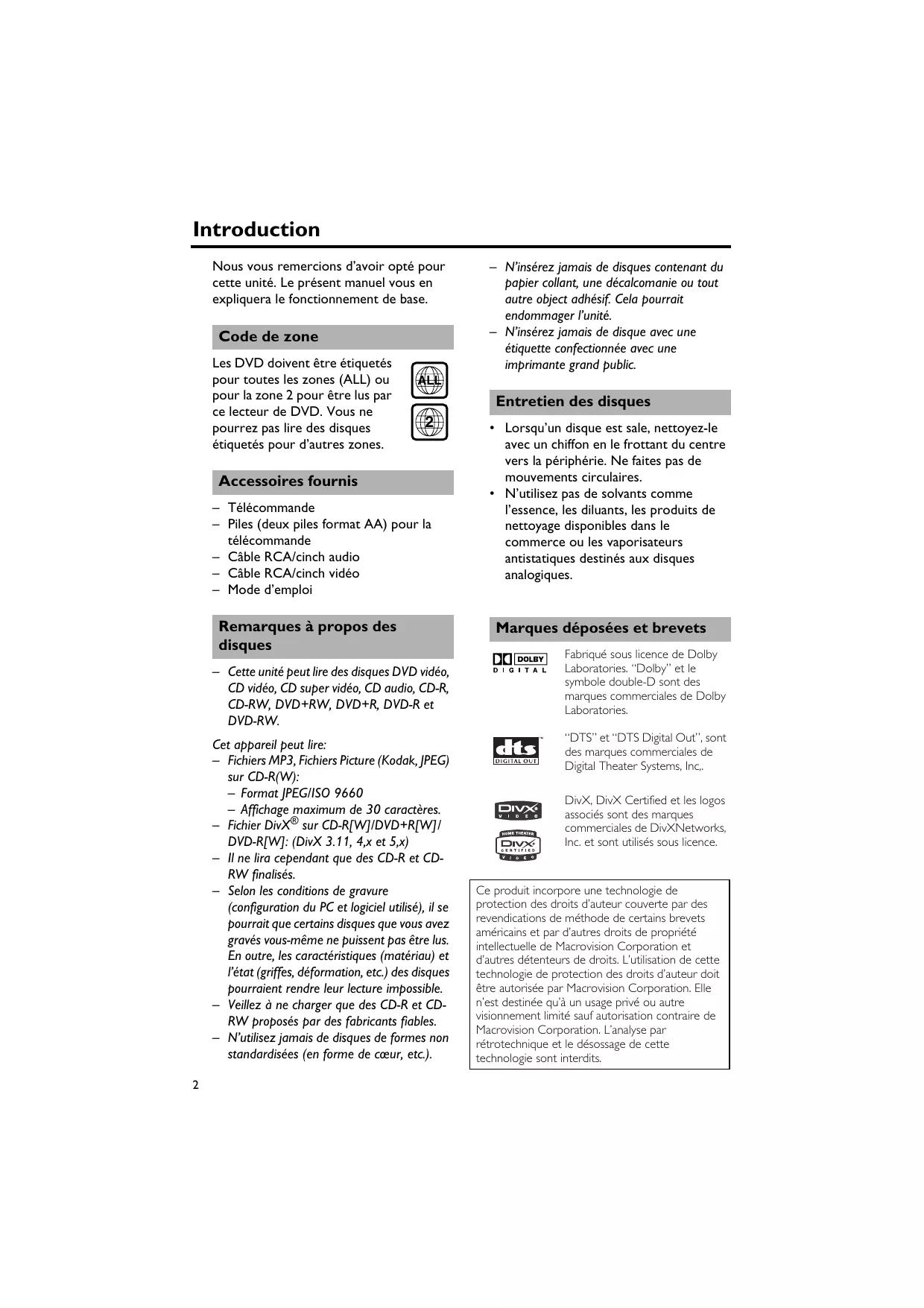 • Lecture simultanée de fichiers de musique MP3 et d’images JPEG Introduction Nous vous remercions d’avoir opté pour cette unité. Le présent manuel vous en expliquera le fonctionnement de base. Code de zone Les DVD doivent être étiquetés pour toutes les zones (ALL) ou pour la zone 2 pour être lus par ce lecteur de DVD. Vous ne pourrez pas lire des disques étiquetés pour d’autres zones. ALL Entretien des disques p. 16