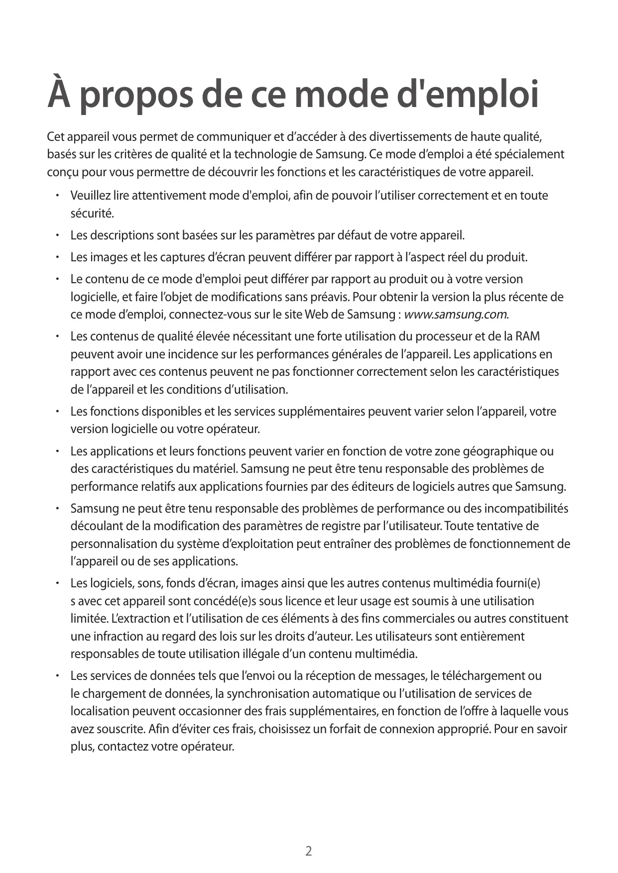 - Le contenu de ce mode d'emploi peut différer par rapport au produit ou à votre version logicielle, et faire l’objet de modifications sans préavis. Pour obtenir la version la plus récente de ce mode d’emploi, connectez-vous sur le site Web de Samsung : www.samsung.com.