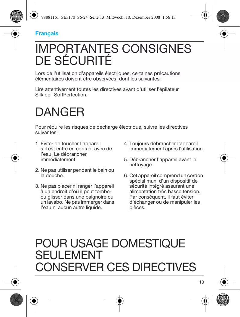 8. Toujours relier la fiche à l’appareil avant de brancher sur la prise de courant. Pour débrancher, placer l’interrupteur à « arrêt », puis retirer la fiche de la prise. 9. Utiliser seulement le cordon d’alimentation spécial fourni avec l’épilateur Silk·épil SoftPerfection.