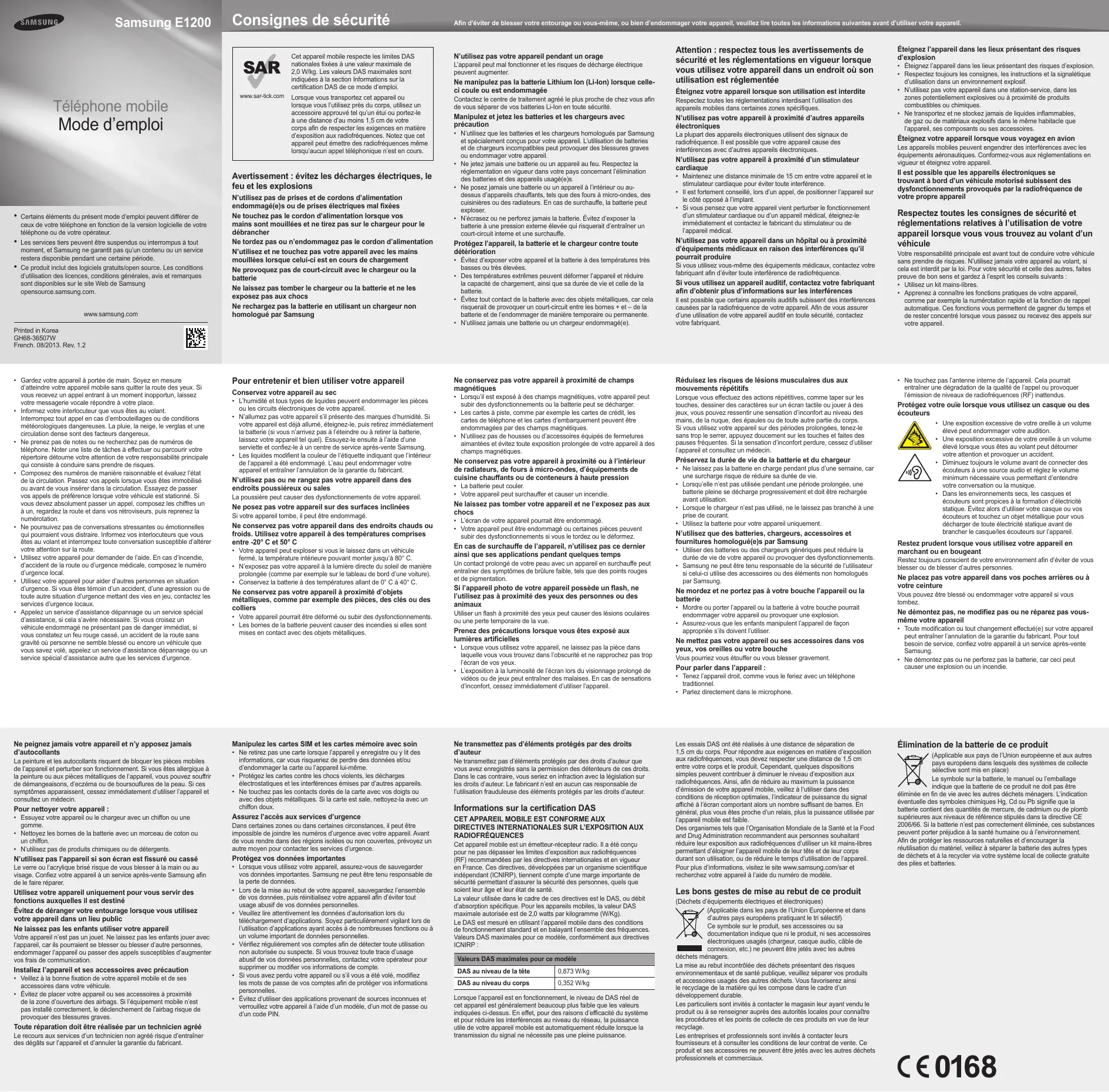 Samsung E1200 Consignes de sécurité Cet appareil mobile respecte les limites DAS nationales fixées à une valeur maximale de 2,0 W/kg. Les valeurs DAS maximales sont indiquées à la section Informations sur la certification DAS de ce mode d’emploi. Téléphone mobile Mode d’emploi www.sar-tick.com Lorsque vous transportez cet appareil ou lorsque vous l’utilisez près du corps, utilisez un accessoire approuvé tel qu’un étui ou portez-le à une distance d’au moins 1,5 cm de votre corps afin de respecter les exigences en matière d’exposition aux radiofréquences. Notez que cet appareil peut émettre des radiofréquences même lorsqu’aucun appel téléphonique n’est en cours.