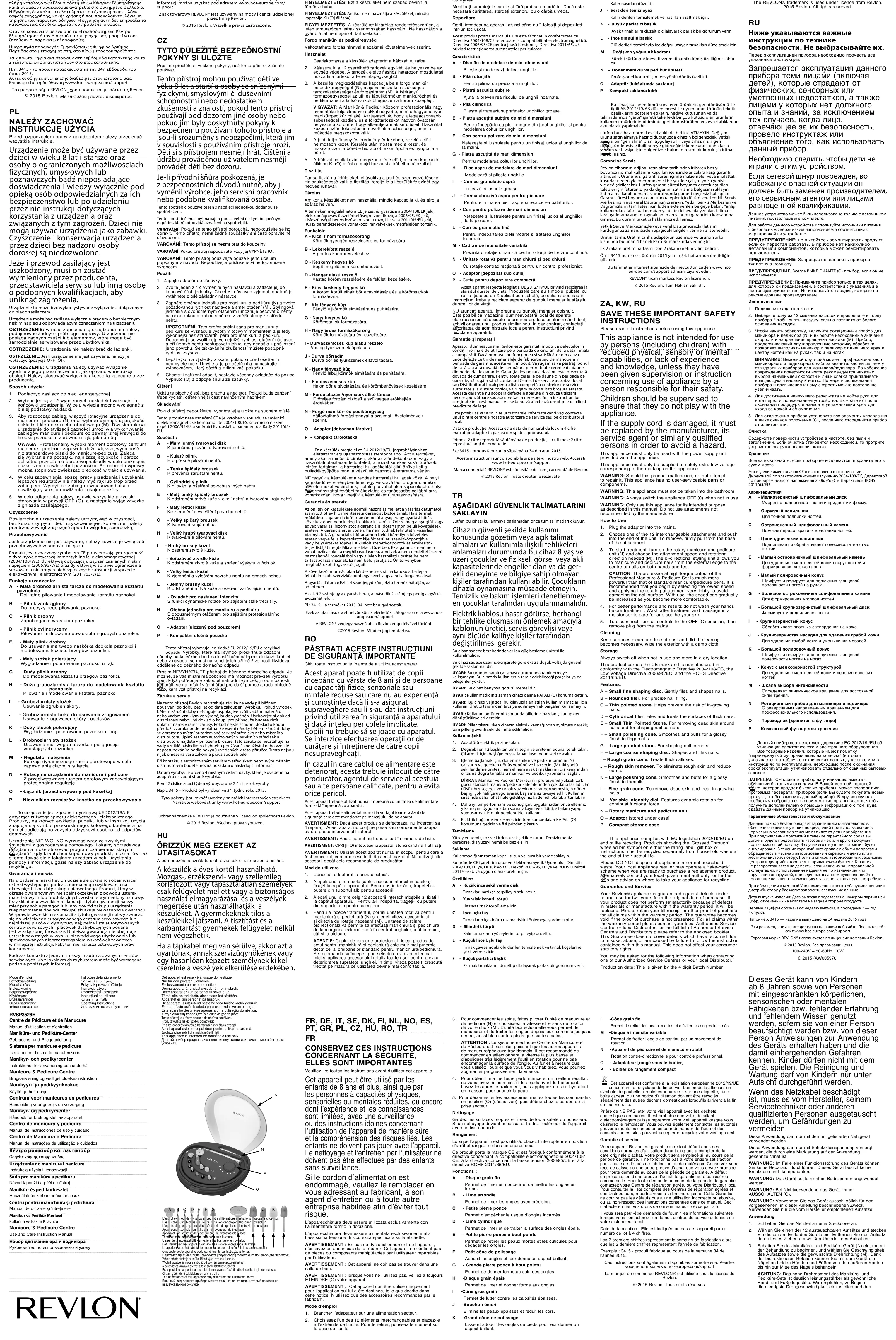 Permet de retirer les peaux mortes et d’éviter les ongles incarnés. Permet de frotter l’ongle en continu par un movement de rotation. Rotation contre-directionnelle pour contrôle professionnel. - Boîtier de rangement compact Cet appareil est conforme à la législation européenne 2012/19/UE concernant le recyclage de fin de vie. Les produits affichant un symbole de poubelle à roulettes « barrée » sur une étiquette, une boîte cadeau ou une notice d’utilisation doivent être recyclés séparément des autres déchets domestiques lorsqu’ils arrivent à la fin de leur vie utile. Prière de NE PAS jeter votre vieil appareil avec les déchets domestiques ordinaires. Il est probable que votre détaillant d’électroménagers puisse reprendre votre vieil appareil lorsque vous désirerez le remplacer. Vous pouvez également contacter les autorités gouvernementales compétentes pour demander de l’aide et des conseils sur les sites pouvant accepter et recycler votre vieil appareil. Garantie et service Votre appareil Revlon est garanti contre tout défaut dans des conditions normales d’utilisation durant cinq ans à compter de la date originale d’achat. Votre produit sera remplacé si, au cours de la période de garantie, il ne fonctionne pas à votre entière satisfaction pour cause de défauts de fabrication ou de matériaux. Conservez votre reçu de caisse ou une autre preuve d’achat que vous devrez produire pour toute demande au cours de la période de garantie. À défaut de présentation d’une preuve d’achat, la garantie sera considérée comme nulle. Pour toute demande au cours de la période de garantie, contactez votre Centre de réparation agréé, ou votre Distributeur local. Pour consulter la liste complète des Centres de réparation agréés et des Distributeurs, reportez-vous à la brochure jointe. Cette Garantie ne couvre pas les défauts dus à une utilisation incorrecte ou abusive, ou au non-respect des instructions contenues dans ce manuel. Ceci n’affecte en rien vos droits de consommateur prévus par la loi.