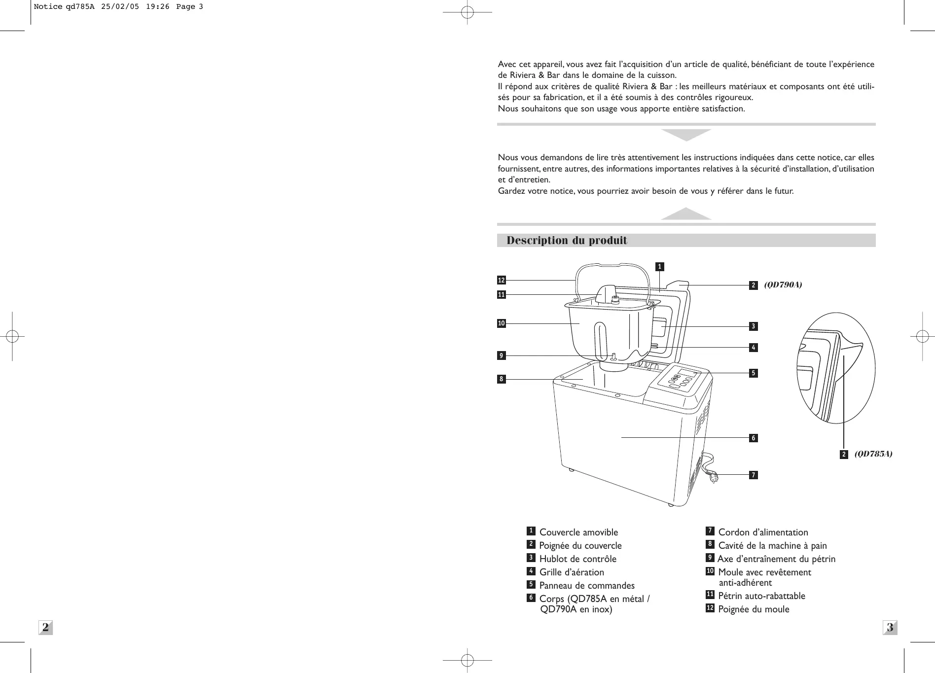 Le ranger hors de leur portée. Son emploi doit être réservé à des personnes parfaitement au courant de la manière de l'utiliser. Ne brancher l’appareil que sur une prise répondant aux prescriptions de sécurité avec mise à la terre. Dans le cas où une rallonge est nécessaire, utiliser une rallonge avec prise de terre incorporée et d’une intensité nominale suffisante pour supporter l’alimentation de l’appareil. S’assurer que la tension du secteur correspond bien à celle marquée sur la plaque signalétique de l’appareil. Afin d’éviter une surcharge du réseau électrique, veiller à ne pas brancher d’autres appareils de forte consommation électrique sur le même circuit. S’assurer avant chaque utilisation que le câble d’alimentation est en parfait état. Ne pas laisser l'appareil branché sans surveillance. Ne jamais utiliser l’appareil à l’extérieur. Ne pas placer l'appareil près d'une source de chaleur et éviter que le cordon d’alimentation ne touche des surfaces chaudes. Placer la machine à distance suffisante des parois ou des objets pouvant prendre feu (rideaux, torchons…). Ne jamais tirer sur le cordon d'alimentation ou sur l'appareil lui-même pour débrancher l'appareil. Afin d’éviter tout danger en cas d’endommagement du cordon d’alimentation, celui-ci doit être remplacé par un professionnel d’un centre service agréé Riviera & Bar. En cas de panne ou de mauvais fonctionnement, ne pas chercher à réparer l’appareil soimême, mais le confier à un centre service agréé Riviera & Bar. Cet appareil est prévu pour un usage domestique. Une utilisation non adéquate et/ou non conforme au mode d’emploi annule la garantie et ne peut engager la responsabilité du fabricant.