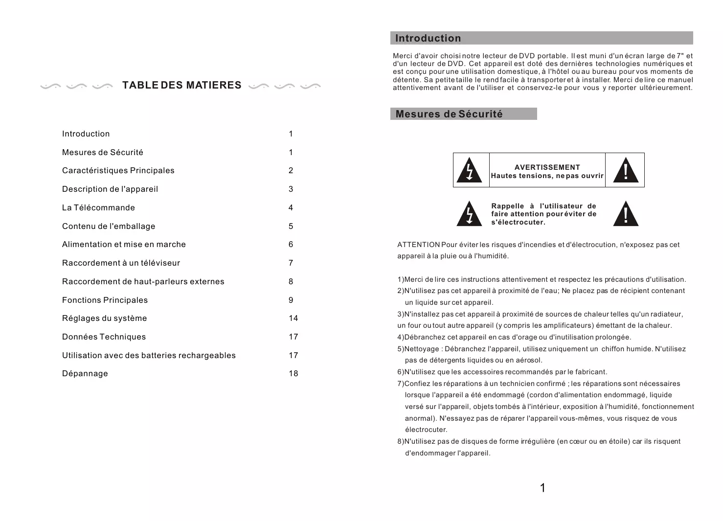 un liquide sur cet appareil. 3)N'installez pas cet appareil à proximité de sources de chaleur telles qu'un radiateur, un four ou tout autre appareil (y compris les amplificateurs) émettant de la chaleur. 4)Débranchez cet appareil en cas d'orage ou d'inutilisation prolongée. 5)Nettoyage : Débranchez l'appareil, utilisez uniquement un chiffon humide. N'utilisez pas de détergents liquides ou en aérosol. 6)N'utilisez que les accessoires recommandés par le fabricant. 7)Confiez les réparations à un technicien confirmé ; les réparations sont nécessaires lorsque l'appareil a été endommagé (cordon d'alimentation endommagé, liquide versé sur l'appareil, objets tombés à l'intérieur, exposition à l'humidité, fonctionnement anormal). N'essayez pas de réparer l'appareil vous-mêmes, vous risquez de vous électrocuter. 8)N'utilisez pas de disques de forme irrégulière (en cœur ou en étoile) car ils risquent d'endommager l'appareil. Caractéristiques Principales Description de l'appareil Ecran couleur LCD 7" à forte luminosité. Compatible avec les disques suivants : DVD, VCD, MP3, MP4, CD, JPEG, XviD etc. Haut-parleurs stéréo intégrés. Batterie rechargeable de type Lithium-polymère Compatible avec les standards PAL et NTSC Interface utilisateur multilingue, avance et retour rapide, fonction répétition. Zoom