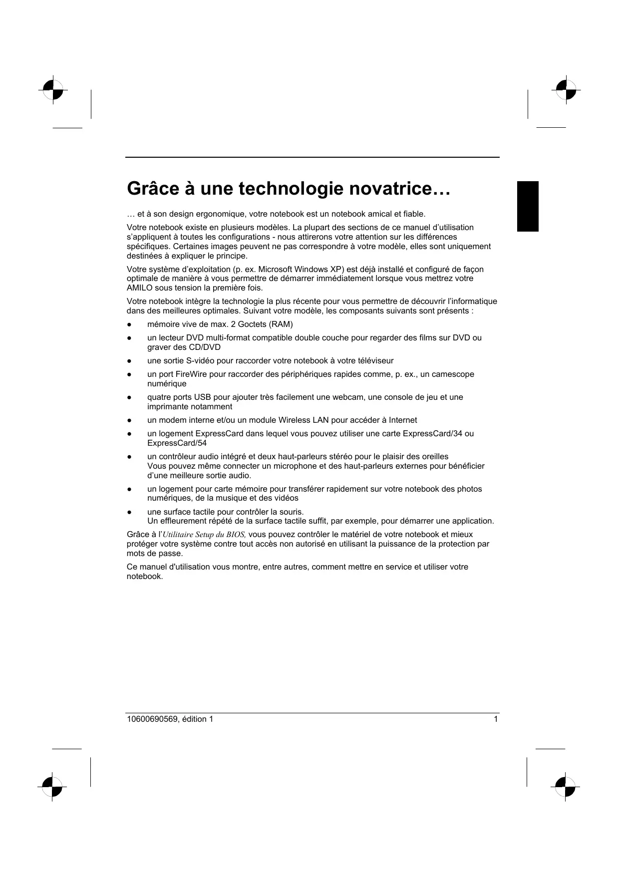 Remarques du constructeur Elimination et recyclage Vous trouverez des informations à ce sujet sur le CD/DVD "Drivers & Utilities" fourni. Déclarations de conformité (Declarations of Conformity) Vous trouverez les déclarations de conformité (Declarations of Conformity) pour cet AMILO sur Internet à l’adresse www.fujitsu-siemens.com. Par la présente Fujitsu Siemens Computers déclare que l'AMILO est conforme aux exigences essentielles et aux autres dispositions pertinentes de la directive 1999/5/CE. Technologie protégée par copyright Ce produit renferme une technologie protégée par un copyright et par des droits de procédure inhérents à certains brevets américains et à d’autres droits de propriété intellectuelle détenus par Macrovision Corporation et d’autres détenteurs de brevets. L’application de cette technologie protégée par copyright doit faire l'objet d'une autorisation par Macrovision Corporation ; elle est exclusivement réservée à un usage privé et à d'autres usages limités pour autant que Macrovision Corporation n'autorise expressément une autre utilisation. La rétro-technique ou le désassemblage sont interdits. 10600690569, édition 1