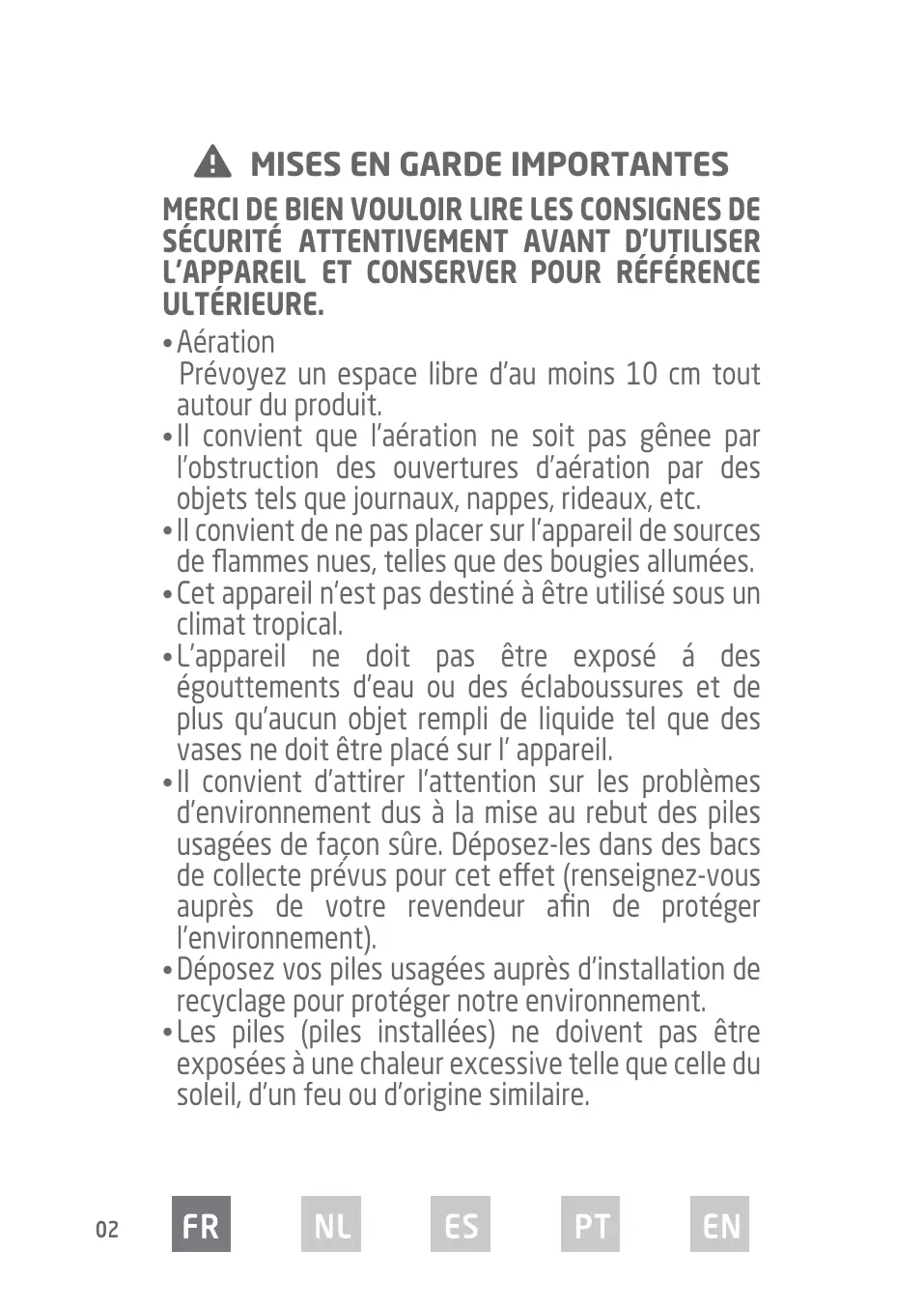 L'APPAREIL ET CONSERVER POUR RÉFÉRENCE ULTÉRIEURE. tAération Prévoyez un espace libre d'au moins 10 cm tout autour du produit. tIl convient que l’aération ne soit pas gênee par l’obstruction des ouvertures d’aération par des objets tels que journaux, nappes, rideaux, etc. tll convient de ne pas placer sur l’appareil de sources de flammes nues, telles que des bougies allumées. tCet appareil n'est pas destiné à être utilisé sous un climat tropical. tL’appareil ne doit pas être exposé á des égouttements d'eau ou des éclaboussures et de plus qu'aucun objet rempli de liquide tel que des vases ne doit être placé sur l’ appareil. tIl convient d’attirer l’attention sur les problèmes d’environnement dus à la mise au rebut des piles usagées de façon sûre. Déposez-les dans des bacs de collecte prévus pour cet effet (renseignez-vous auprès de votre revendeur afin de protéger l'environnement). tDéposez vos piles usagées auprès d'installation de recyclage pour protéger notre environnement. tLes piles (piles installées) ne doivent pas être exposées à une chaleur excessive telle que celle du soleil, d'un feu ou d'origine similaire.
