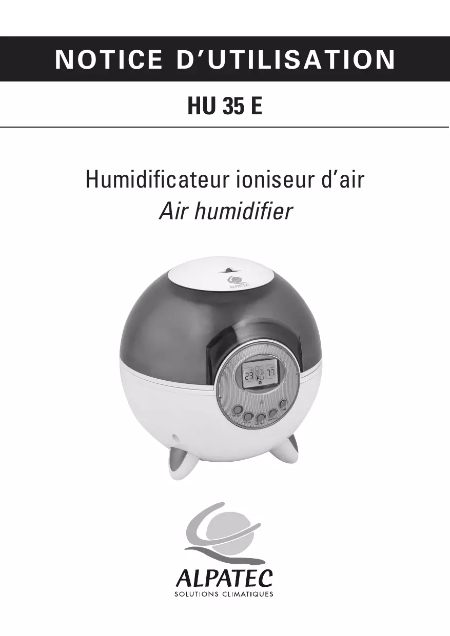 N O T I C E D ’ U T I L ISATION HU 35 E Humidificateur ioniseur d’air Air humidifier FR A N Ç A I S ALPATEC vous félicite d’avoir choisi ce produit et vous remercie de votre confiance. Pour votre confort et votre sécurité, votre article a été vérifié à toutes les étapes de sa fabrication et a passé avec succès tous nos tests de qualité. Nos produits sont conçus pour vous plaire tant par leur design que par leur facilité d’utilisation et dans l’objectif de vous apporter complète satisfaction.