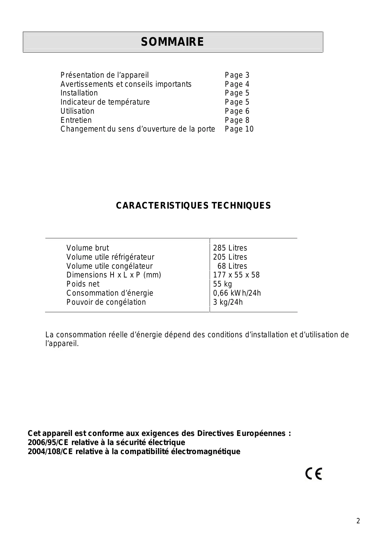 SOMMAIRE Présentation de l’appareil Avertissements et conseils importants Installation Indicateur de température Utilisation Entretien Changement du sens d’ouverture de la porte Page 3 Page 4 Page 5 Page 5 Page 6 Page 8 Page 10 CARACTERISTIQUES TECHNIQUES Volume brut Volume utile réfrigérateur Volume utile congélateur Dimensions H x L x P (mm) Poids net Consommation d’énergie Pouvoir de congélation 285 Litres 205 Litres 68 Litres 177 x 55 x 58 55 kg 0,66 kWh/24h 3 kg/24h La consommation réelle d’énergie dépend des conditions d’installation et d’utilisation de l’appareil. Cet appareil est conforme aux exigences des Directives Européennes : 2006/95/CE relative à la sécurité électrique 2004/108/CE relative à la compatibilité électromagnétique