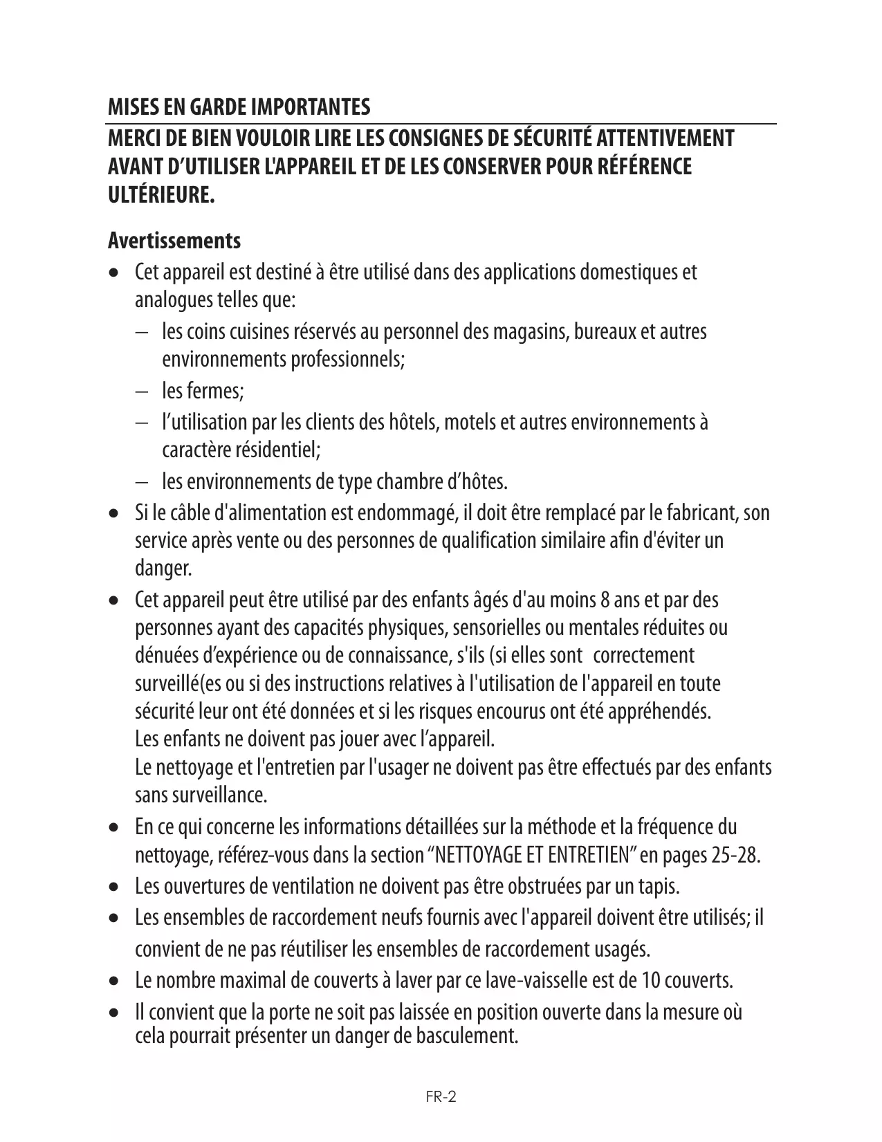 1-1. x MISE EN GARDE: Les couteaux et les autres ustensiles pointus doivent être placés dans le panier pointe vers le bas ou en position horizontale. x La pression maximale admissible pour l’arrivée d’eau est de 1 MPa. La pression minimale admissible pour l’arrivée d’eau est de 0,04 MPa. x La fiche de prise de courant doit demeurer facilement accessible après l'installation de l'appareil. x En ce qui concerne les informations détaillées sur la méthode d’installation et comment l'appareil doit être fixé sur son support, référez-vous dans la section “ INSTRUCTIONS D’INSTALLATION ” en pages 7-1. Précautions de sécurité x L'installation et les réparations doivent être effectuées par du personnel qualifié. x Cet appareil est conçu pour une utilisation domestique seulement. x Pour éviter tout risque de choc électrique, n’immergez pas l'appareil, le câble ou la prise d’alimentation dans de l'eau ou dans tout autre liquide. x Les enfants doivent être surveillés pour s'assurer qu'ils ne jouent pas avec l'appareil. x Éteignez et débranchez l'appareil avant le nettoyage et l'entretien. x Ne vous asseyez pas et ne vous tenez pas debout sur la porte ou sur la grille du lavevaisselle. x Ne faites pas fonctionner votre lave-vaisselle si tous les panneaux de l’appareil ne sont pas correctement en place. x Lorsque vous faites fonctionner le lave-vaisselle, ouvrez soigneusement la porte, car de l’eau peut être éjectée. x Ne placez pas d'objet lourd sur la porte lorsqu'elle est ouverte. L'appareil pourrait basculer vers l'avant. x Certains détergents pour lave-vaisselle sont fortement alcalins. Ils peuvent être extrêmement dangereux s'ils sont avalés. Évitez tout contact avec la peau et les yeux et éloignez les enfants du lave-vaisselle lorsque la porte est ouverte. x Ne lavez pas d'articles en plastique à moins qu'ils ne portent la mention « peut être lavé au lave-vaisselle » ou l'équivalent. FR-3