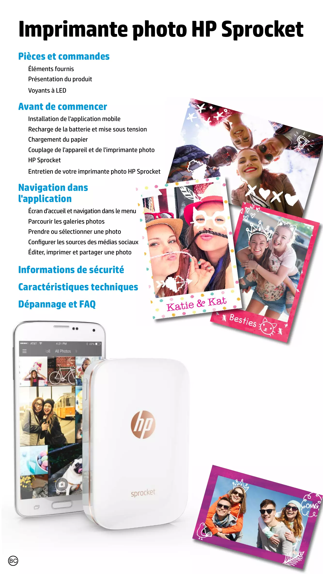 Imprimante photo HP Sprocket Pièces et commandes Éléments fournis Présentation du produit Voyants à LED Avant de commencer Installation de l'application mobile Recharge de la batterie et mise sous tension Chargement du papier Couplage de l'appareil et de l'imprimante photo HP Sprocket Entretien de votre imprimante photo HP Sprocket Navigation dans l'application Écran d'accueil et navigation dans le menu Parcourir les galeries photos Prendre ou sélectionner une photo Configurer les sources des médias sociaux Éditer, imprimer et partager une photo Informations de sécurité Caractéristiques techniques Dépannage et FAQ Pièces et commandes Éléments fournis Imprimante photo HP Sprocket Carte de configuration Papier Photo adhésif HP ZINK® (10 pages) Câble USB Fiche d'informations réglementaires Présentation du produit