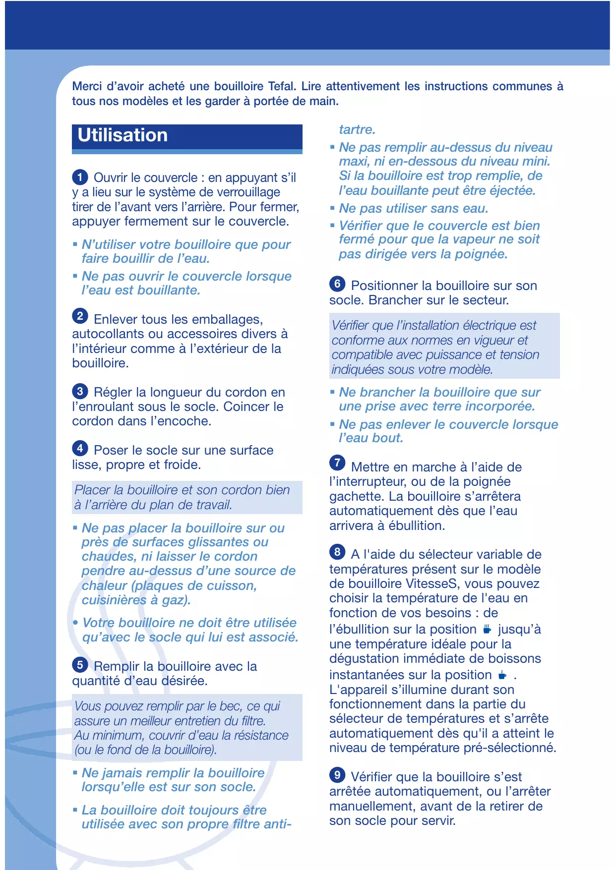 Merci d’avoir acheté une bouilloire Tefal. Lire attentivement les instructions communes à tous nos modèles et les garder à portée de main. Utilisation 1 Ouvrir le couvercle : en appuyant s’il y a lieu sur le système de verrouillage tirer de l’avant vers l’arrière. Pour fermer, appuyer fermement sur le couvercle. N’utiliser votre bouilloire que pour faire bouillir de l’eau. Ne pas ouvrir le couvercle lorsque l’eau est bouillante. 2 Enlever tous les emballages, autocollants ou accessoires divers à l’intérieur comme à l’extérieur de la bouilloire. 3 Régler la longueur du cordon en l’enroulant sous le socle. Coincer le cordon dans l’encoche. 4 Poser le socle sur une surface lisse, propre et froide. Placer la bouilloire et son cordon bien à l’arrière du plan de travail. Ne pas placer la bouilloire sur ou près de surfaces glissantes ou chaudes, ni laisser le cordon pendre au-dessus d’une source de chaleur (plaques de cuisson, cuisinières à gaz).