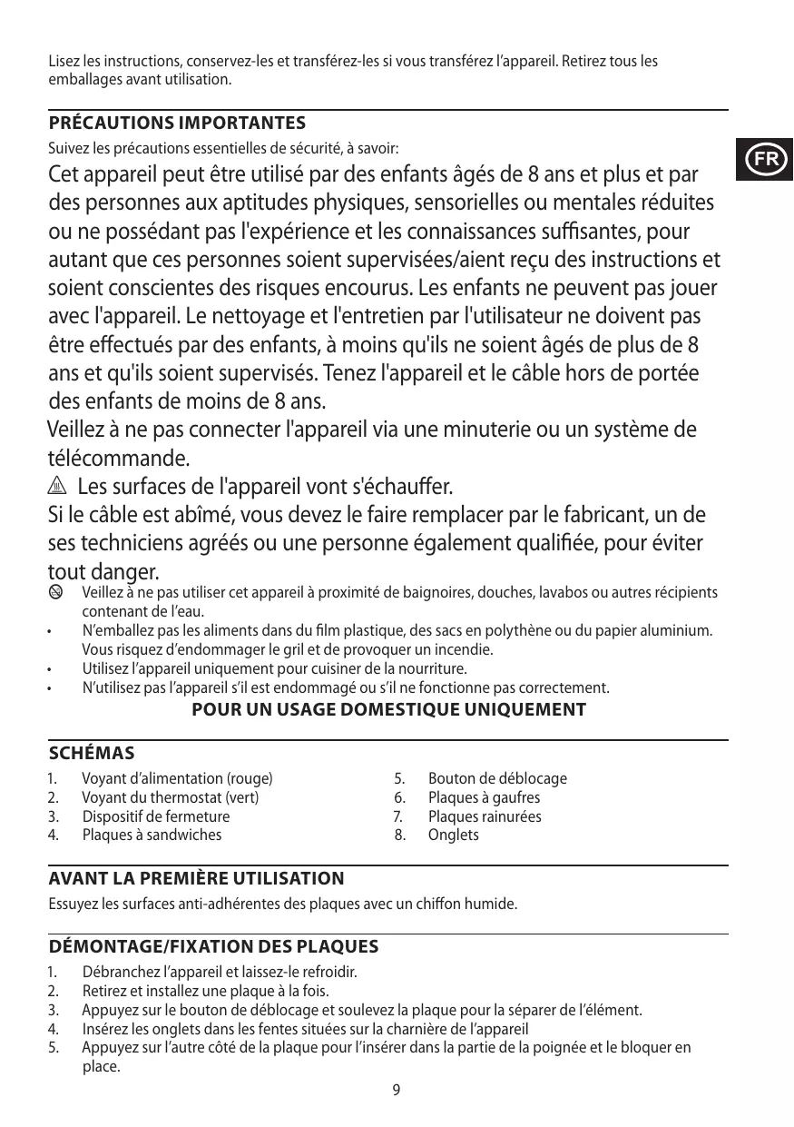 Veillez à ne pas utiliser cet appareil à proximité de baignoires, douches, lavabos ou autres récipients contenant de l'eau. N'emballez pas les aliments dans du film plastique, des sacs en polythène ou du papier aluminium. Vous risquez d'endommager le grill et de provoquer un incendie. Utilisez l'appareil uniquement pour cuisiner de la nourriture. N'utilisez pas l'appareil s'il est endommagé ou s'il ne fonctionne pas correctement.
