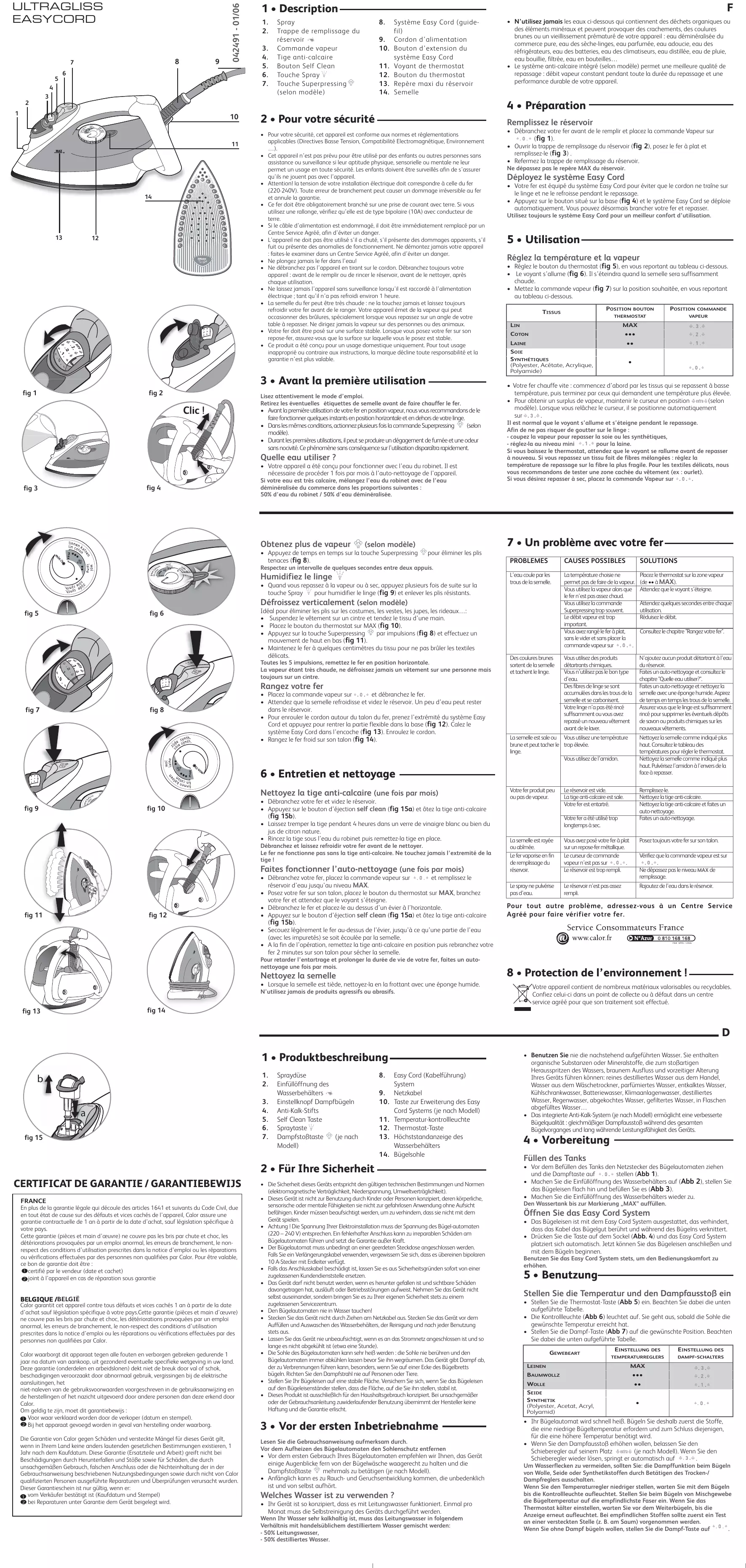 - Maintenez le fer à quelques centimètres du tissu pour ne pas brûler les textiles délicats. Toutes les 5 impulsions, remettez le fer en position horizontale. La vapeur étant très chaude, ne défroissez jamais un vêtement sur une personne mais toujours sur un cintre. Des coulures brunes sortent de la semelle et tachent le linge. Rangez votre fer fig 7 fig 8