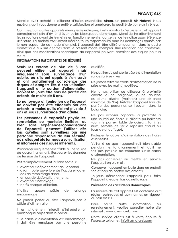 rallonge Ne jamais porter ou tirer l‘appareil par le câble d‘alimentation. Il est strictement interdit d‘introduire un quelconque objet dans le boîtier. Si le câble d‘alimentation est endommagé, il doit être remplacé par une personne qualifiée. Ne pas tirer ou coincer le câble d‘alimentation sur des arêtes vives. Ne jamais retirer le câble d‘alimentation de la prise avec les mains mouillées. Ne jamais utiliser ce diffuseur à proximité directe d‘une baignoire, d‘une douche ou d‘une piscine (maintenir une distance minimale de 3m). Installer l‘appareil hors de portée des personnes se trouvant dans la baignoire. Ne pas exposer l‘appareil à proximité à une source de chaleur, directe ou indirecte (comme par ex. table de cuisson, flammes nues, semelle de fer à repasser chaud ou fours de chauffage). Protéger le câble d‘alimentation des huiles essentielles. Veiller à ce que l‘appareil soit bien stable pendant le fonctionnement et qu‘il ne soit pas possible de trébucher sur le câble d‘alimentation. Ne pas conserver ou mettre en service l‘appareil en plein air. Conserver l‘appareil emballé dans un endroit sec et hors de portée des enfants. Toujours débrancher l‘appareil pour faire l‘appoint d‘eau et lors du nettoyage. Prévention des accidents domestiques La sécurité de cet appareil est conforme aux règles techniques et aux normes en vigueur au sein de l’UE. Pour toute autre information renseignement, veuillez consulter notre site internet : www.airnaturel.com Notre service clients est à votre écoute à l’adresse suivante : info@airnaturel.com