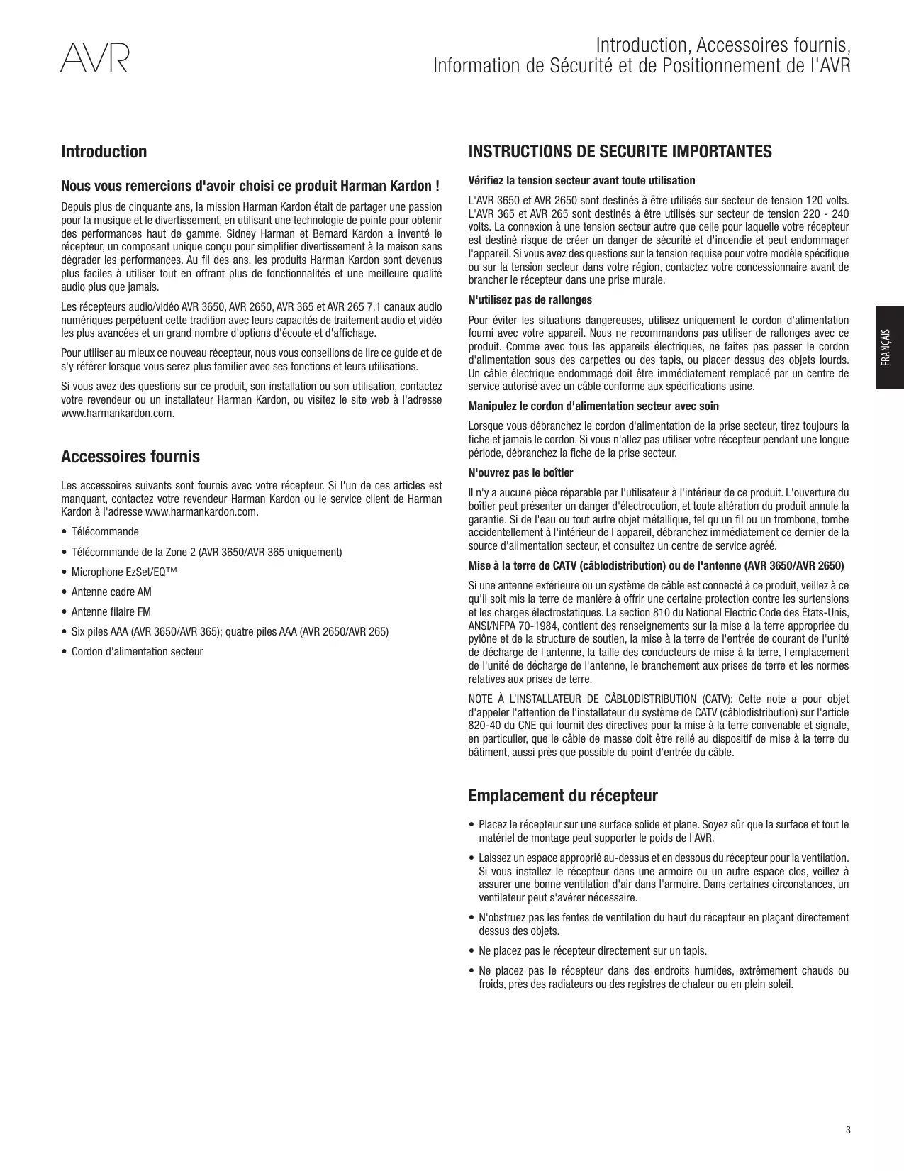 Nous vous remercions d'avoir choisi ce produit Harman Kardon ! Vérifiez la tension secteur avant toute utilisation Depuis plus de cinquante ans, la mission Harman Kardon était de partager une passion pour la musique et le divertissement, en utilisant une technologie de pointe pour obtenir des performances haut de gamme. Sidney Harman et Bernard Kardon a inventé le récepteur, un composant unique conçu pour simplifier divertissement à la maison sans dégrader les performances. Au fil des ans, les produits Harman Kardon sont devenus plus faciles à utiliser tout en offrant plus de fonctionnalités et une meilleure qualité audio plus que jamais. Les récepteurs audio/vidéo AVR 3650, AVR 2650, AVR 365 et AVR 265 7.1 canaux audio numériques perpétuent cette tradition avec leurs capacités de traitement audio et vidéo les plus avancées et un grand nombre d'options d'écoute et d'affichage. Pour utiliser au mieux ce nouveau récepteur, nous vous conseillons de lire ce guide et de s'y référer lorsque vous serez plus familier avec ses fonctions et leurs utilisations. Si vous avez des questions sur ce produit, son installation ou son utilisation, contactez votre revendeur ou un installateur Harman Kardon, ou visitez le site web à l'adresse www.harmankardon.com. Accessoires fournis L'AVR 3650 et AVR 2650 sont destinés à être utilisés sur secteur de tension 120 volts. L'AVR 365 et AVR 265 sont destinés à être utilisés sur secteur de tension 220 - 240 volts. La connexion à une tension secteur autre que celle pour laquelle votre récepteur est destiné risque de créer un danger de sécurité et d'incendie et peut endommager l'appareil. Si vous avez des questions sur la tension requise pour votre modèle spécifique ou sur la tension secteur dans votre région, contactez votre concessionnaire avant de brancher le récepteur dans une prise murale. N'utilisez pas de rallonges Pour éviter les situations dangereuses, utilisez uniquement le cordon d'alimentation fourni avec votre appareil. Nous ne recommandons pas utiliser de rallonges avec ce produit. Comme avec tous les appareils électriques, ne faites pas passer le cordon d'alimentation sous des carpettes ou des tapis, ou placer dessus des objets lourds. Un câble électrique endommagé doit être immédiatement remplacé par un centre de service autorisé avec un câble conforme aux spécifications usine. Manipulez le cordon d'alimentation secteur avec soin Lorsque vous débranchez le cordon d'alimentation de la prise secteur, tirez toujours la fiche et jamais le cordon. Si vous n'allez pas utiliser votre récepteur pendant une longue période, débranchez la fiche de la prise secteur. N'ouvrez pas le boîtier Les accessoires suivants sont fournis avec votre récepteur. Si l'un de ces articles est manquant, contactez votre revendeur Harman Kardon ou le service client de Harman Kardon à l'adresse www.harmankardon.com. s Télécommande s Télécommande de la Zone 2 (AVR 3650/AVR 365 uniquement) Il n'y a aucune pièce réparable par l'utilisateur à l'intérieur de ce produit. L'ouverture du boîtier peut présenter un danger d'électrocution, et toute altération du produit annule la garantie. Si de l'eau ou tout autre objet métallique, tel qu'un fil ou un trombone, tombe accidentellement à l'intérieur de l'appareil, débranchez immédiatement ce dernier de la source d'alimentation secteur, et consultez un centre de service agréé. s Microphone EzSet/EQ™ Mise à la terre de CATV (câblodistribution) ou de l'antenne (AVR 3650/AVR 2650) s Antenne cadre AM Si une antenne extérieure ou un système de câble est connecté à ce produit, veillez à ce qu'il soit mis la terre de manière à offrir une certaine protection contre les surtensions et les charges électrostatiques. La section 810 du National Electric Code des États-Unis, ANSI/NFPA 70-1984, contient des renseignements sur la mise à la terre appropriée du pylône et de la structure de soutien, la mise à la terre de l'entrée de courant de l'unité de décharge de l'antenne, la taille des conducteurs de mise à la terre, l'emplacement de l'unité de décharge de l'antenne, le branchement aux prises de terre et les normes relatives aux prises de terre. s Antenne filaire FM s Six piles AAA (AVR 3650/AVR 365); quatre piles AAA (AVR 2650/AVR 265) s Cordon d'alimentation secteur NOTE À L’INSTALLATEUR DE CÂBLODISTRIBUTION (CATV): Cette note a pour objet d'appeler l'attention de l'installateur du système de CATV (câblodistribution) sur l'article 820-40 du CNE qui fournit des directives pour la mise à la terre convenable et signale, en particulier, que le câble de masse doit être relié au dispositif de mise à la terre du bâtiment, aussi près que possible du point d'entrée du câble. Emplacement du récepteur s Placez le récepteur sur une surface solide et plane. Soyez sûr que la surface et tout le matériel de montage peut supporter le poids de l'AVR. s Laissez un espace approprié au-dessus et en dessous du récepteur pour la ventilation. Si vous installez le récepteur dans une armoire ou un autre espace clos, veillez à assurer une bonne ventilation d'air dans l'armoire. Dans certaines circonstances, un ventilateur peut s'avérer nécessaire. s N'obstruez pas les fentes de ventilation du haut du récepteur en plaçant directement dessus des objets. s Ne placez pas le récepteur directement sur un tapis. s Ne placez pas le récepteur dans des endroits humides, extrêmement chauds ou froids, près des radiateurs ou des registres de chaleur ou en plein soleil.