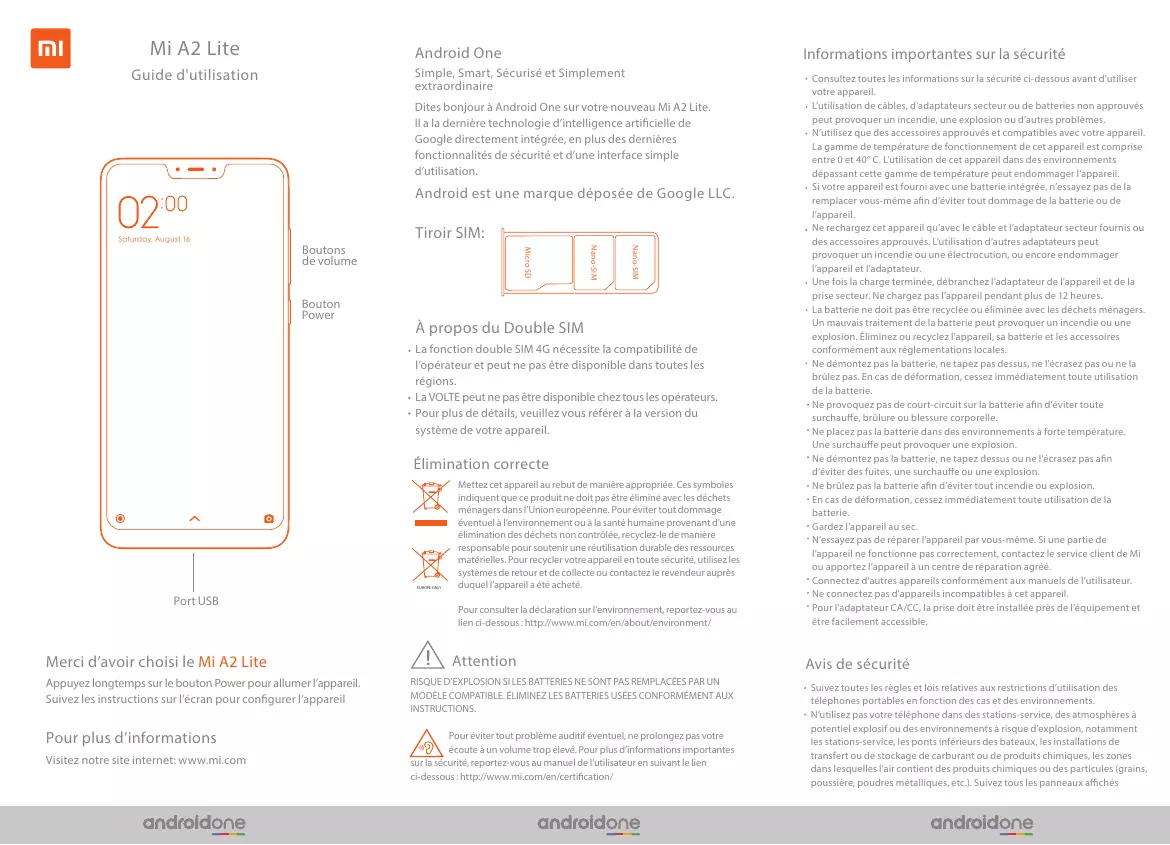 Mi A2 Lite Android One Informations importantes sur la sécurité Simple, Smart, Sécurisé et Simplement extraordinaire Guide d'utilisation Dites bonjour à Android One sur votre nouveau Mi A2 Lite. Il a la dernière technologie d’intelligence artificielle de Google directement intégrée, en plus des dernières fonctionnalités de sécurité et d’une interface simple d’utilisation. Android est une marque déposée de Google LLC. Saturday, August 16 Nano-SIM Nano-SIM Bouton Power Tiroir SIM: Micro SD Boutons de volume À propos du Double SIM La fonction double SIM 4G nécessite la compatibilité de l’opérateur et peut ne pas être disponible dans toutes les régions. La VOLTE peut ne pas être disponible chez tous les opérateurs. Pour plus de détails, veuillez vous référer à la version du système de votre appareil. Élimination correcte EUROPE ONLY Port USB Merci d’avoir choisi le Mi A2 Lite Mettez cet appareil au rebut de manière appropriée. Ces symboles indiquent que ce produit ne doit pas être éliminé avec les déchets ménagers dans l’Union européenne. Pour éviter tout dommage éventuel à l’environnement ou à la santé humaine provenant d’une élimination des déchets non contrôlée, recyclez-le de manière responsable pour soutenir une réutilisation durable des ressources matérielles. Pour recycler votre appareil en toute sécurité, utilisez les systèmes de retour et de collecte ou contactez le revendeur auprès duquel l’appareil a été acheté. Pour consulter la déclaration sur l’environnement, reportez-vous au lien ci-dessous : http://www.mi.com/en/about/environment/ Attention Appuyez longtemps sur le bouton Power pour allumer l’appareil. Suivez les instructions sur l’écran pour configurer l’appareil RISQUE D’EXPLOSION SI LES BATTERIES NE SONT PAS REMPLACÉES PAR UN MODÈLE COMPATIBLE. ÉLIMINEZ LES BATTERIES USÉES CONFORMÉMENT AUX INSTRUCTIONS. Pour plus d’informations Pour éviter tout problème auditif éventuel, ne prolongez pas votre écoute à un volume trop élevé. Pour plus d’informations importantes sur la sécurité, reportez-vous au manuel de l’utilisateur en suivant le lien ci-dessous : http://www.mi.com/en/certification/ Visitez notre site internet: www.mi.com Consultez toutes les informations sur la sécurité ci-dessous avant d’utiliser votre appareil. L’utilisation de câbles, d’adaptateurs secteur ou de batteries non approuvés peut provoquer un incendie, une explosion ou d’autres problèmes. N’utilisez que des accessoires approuvés et compatibles avec votre appareil. La gamme de température de fonctionnement de cet appareil est comprise entre 0 et 40° C. L’utilisation de cet appareil dans des environnements dépassant cette gamme de température peut endommager l’appareil. Si votre appareil est fourni avec une batterie intégrée, n’essayez pas de la remplacer vous-même afin d’éviter tout dommage de la batterie ou de l’appareil. Ne rechargez cet appareil qu’avec le câble et l’adaptateur secteur fournis ou des accessoires approuvés. L’utilisation d’autres adaptateurs peut provoquer un incendie ou une électrocution, ou encore endommager l’appareil et l’adaptateur. Une fois la charge terminée, débranchez l’adaptateur de l’appareil et de la prise secteur. Ne chargez pas l’appareil pendant plus de 12 heures. La batterie ne doit pas être recyclée ou éliminée avec les déchets ménagers. Un mauvais traitement de la batterie peut provoquer un incendie ou une explosion. Éliminez ou recyclez l’appareil, sa batterie et les accessoires conformément aux réglementations locales. Ne démontez pas la batterie, ne tapez pas dessus, ne l’écrasez pas ou ne la brûlez pas. En cas de déformation, cessez immédiatement toute utilisation de la batterie. Ne provoquez pas de court-circuit sur la batterie afin d’éviter toute surchauffe, brûlure ou blessure corporelle. Ne placez pas la batterie dans des environnements à forte température. Une surchauffe peut provoquer une explosion. Ne démontez pas la batterie, ne tapez dessus ou ne l’écrasez pas afin d’éviter des fuites, une surchauffe ou une explosion. Ne brûlez pas la batterie afin d’éviter tout incendie ou explosion. En cas de déformation, cessez immédiatement toute utilisation de la batterie. Gardez l’appareil au sec. N’essayez pas de réparer l’appareil par vous-même. Si une partie de l’appareil ne fonctionne pas correctement, contactez le service client de Mi ou apportez l’appareil à un centre de réparation agréé. Connectez d’autres appareils conformément aux manuels de l’utilisateur. Ne connectez pas d'appareils incompatibles à cet appareil. Pour l’adaptateur CA/CC, la prise doit être installée près de l’équipement et être facilement accessible. Avis de sécurité Suivez toutes les règles et lois relatives aux restrictions d’utilisation des téléphones portables en fonction des cas et des environnements. N’utilisez pas votre téléphone dans des stations-service, des atmosphères à potentiel explosif ou des environnements à risque d’explosion, notamment les stations-service, les ponts inférieurs des bateaux, les installations de transfert ou de stockage de carburant ou de produits chimiques, les zones dans lesquelles l’air contient des produits chimiques ou des particules (grains, poussière, poudres métalliques, etc.). Suivez tous les panneaux affichés indiquant d’éteindre les appareils sans fil comme votre téléphone ou d’autres équipements radio. Éteignez votre téléphone portable ou appareil sans fil si vous vous trouvez dans une zone de dynamitage ou dans deux zones comportant un panneau indiquant d’éteindre les émetteurs radio bidirectionnels ou les appareils électroniques afin d’éviter toute interférence avec les opérations en cours. N’utilisez pas votre téléphone dans une salle d’opération d'hôpital, une salle d