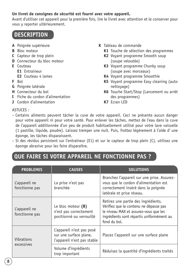 Poignée supérieure Bloc moteur Capteur de trop plein Connecteur du bloc moteur Couteau E1 Entraineur E2 Couteau 4 lames Bol Poignée latérale Connecteur du bol Fiche du cordon d’alimentation Cordon d’alimentation K Tableau de commande K1 Touche de sélection des programmes K2 Voyant programme Smooth soup (soupe veloutée) K3 Voyant programme Chunky soup (soupe avec morceaux) K4 Voyant programme Smoothie K5 Voyant programme Easy cleaning (auto nettoyage) K6 Touche Start/Stop (Lancement ou arrêt des programmes) K7 Ecran LED ASTUCES : ––Certains aliments peuvent tâcher la cuve de votre appareil. Ceci ne présente aucun danger pour votre appareil ni pour votre santé. Pour enlever les tâches, mettez de l’eau dans la cuve de l’appareil additionnée d’un peu de produit habituellement utilisé pour votre lave vaisselle (1 pastille, liquide, poudre). Laissez tremper une nuit. Puis, frottez légèrement à l’aide d’ une éponge, les tâches disparaissent. ––Si des résidus persistent sur l’entraîneur (E1) et sur le capteur de trop plein (C), utilisez une éponge abrasive pour les faire disparaître. QUE FAIRE SI VOTRE APPAREIL NE FONCTIONNE PAS ? PROBLEMES SOLUTIONS L’appareil ne fonctionne pas La prise n’est pas branchée Branchez l’appareil sur une prise. Assurezvous que le cordon d’alimentation est correctement inséré dans la poignée latérale et prise réseau. L’appareil ne fonctionne pas Le bloc moteur (B) n’est pas correctement positionné ou verrouillé Retirez une partie des ingrédients. Vérifiez que le contenu ne dépasse pas le niveau MAX et assurez-vous que les ingrédients sont répartis uniformément au fond du bol. L’appareil n’est pas posé sur une surface plane, l’appareil n’est pas stable Placez l’appareil sur une surface plane Volume d’ingrédients trop important Réduisez la quantité d’ingrédients traités Vibrations excessives