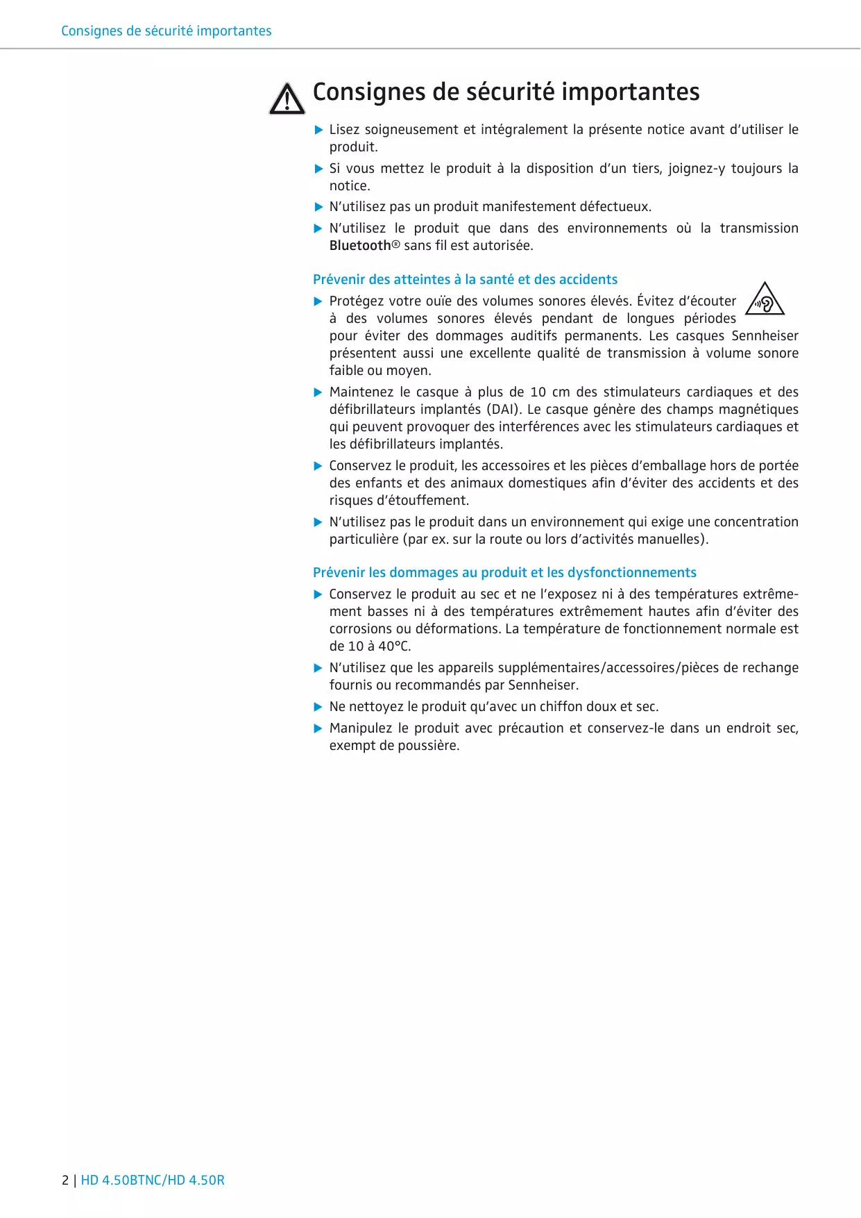 Consignes de sécurité importantes Consignes de sécurité importantes XX Lisez soigneusement et intégralement la présente notice avant d’utiliser le produit. XX Si vous mettez le produit à la disposition d’un tiers, joignez-y toujours la notice. XX N’utilisez pas un produit manifestement défectueux. XX N’utilisez le produit que dans des environnements où la transmission Bluetooth® sans fil est autorisée. Prévenir des atteintes à la santé et des accidents XX Protégez votre ouïe des volumes sonores élevés. Évitez d’écouter à des volumes sonores élevés pendant de longues périodes pour éviter des dommages auditifs permanents. Les casques Sennheiser présentent aussi une excellente qualité de transmission à volume sonore faible ou moyen. XX Maintenez le casque à plus de 10 cm des stimulateurs cardiaques et des défibrillateurs implantés (DAI). Le casque génère des champs magnétiques qui peuvent provoquer des interférences avec les stimulateurs cardiaques et les défibrillateurs implantés. XX Conservez le produit, les accessoires et les pièces d’emballage hors de portée des enfants et des animaux domestiques afin d’éviter des accidents et des risques d’étouffement. XX N’utilisez pas le produit dans un environnement qui exige une concentration particulière (par ex. sur la route ou lors d’activités manuelles). Prévenir les dommages au produit et les dysfonctionnements XX Conservez le produit au sec et ne l’exposez ni à des températures extrêmement basses ni à des températures extrêmement hautes afin d’éviter des corrosions ou déformations. La température de fonctionnement normale est de 10 à 40°C. XX N’utilisez que les appareils supplémentaires/accessoires/pièces de rechange fournis ou recommandés par Sennheiser. XX Ne nettoyez le produit qu’avec un chiffon doux et sec. XX Manipulez le produit avec précaution et conservez-le dans un endroit sec, exempt de poussière.