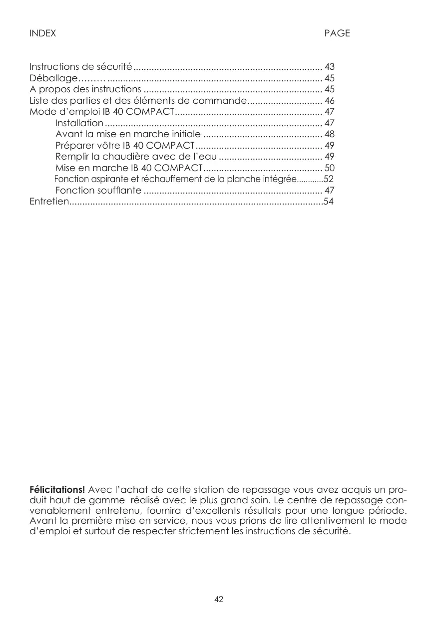 Instructions de sécurité 43 Déballage. 45 À propos des instructions 45 Liste des parties des éléments de commande 46 Mode d'emploi IB 40 COMPACT. 47 Installation 47 Avant la mise en marche initiale 48 Préparez-vous IB 40 COMPACT 49 Remplir la chaudière avec de l'eau 49 Mise en marche IB 40 COMPACT. 50 Fonction aspirante et réchauffement de la planche intégrée........52 Fonction soufflante 47 Entretien. 54