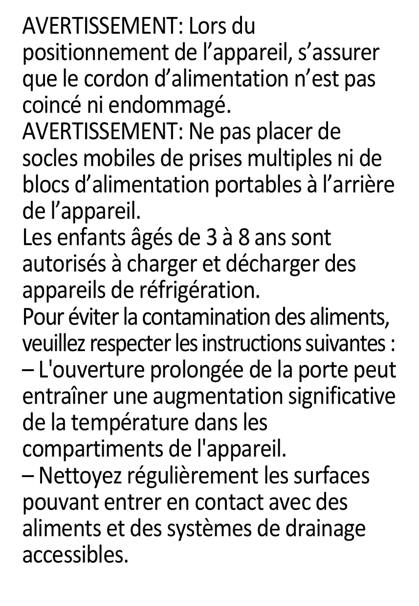AVERTISSEMENT: Lors du positionnement de l’appareil, s’assurer que le cordon d’alimentation n’est pas coincé ni endommagé. AVERTISSEMENT: Ne pas placer de socles mobiles de prises multiples ni de blocs d’alimentation portables à l’arrière de l’appareil. Les enfants âgés de 3 à 8 ans sont autorisés à charger et décharger des appareils de réfrigération. Pour éviter la contamination des aliments, veuillez respecter les instructions suivantes : – L'ouverture prolongée de la porte peut entraîner une augmentation significative de la température dans les compartiments de l'appareil. – Nettoyez régulièrement les surfaces pouvant entrer en contact avec des aliments et des systèmes de drainage accessibles.