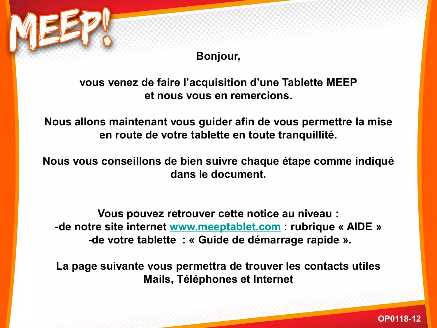 Bonjour, vous venez de faire l’acquisition d’une Tablette MEEP et nous vous en remercions. Nous allons maintenant vous guider afin de vous permettre la mise en route de votre tablette en toute tranquillité. Nous vous conseillons de bien suivre chaque étape comme indiqué dans le document. Vous pouvez retrouver cette notice au niveau : -de notre site internet www.meeptablet.com : rubrique « AIDE » -de votre tablette : « Guide de démarrage rapide ». La page suivante vous permettra de trouver les contacts utiles Mails, Téléphones et Internet OP0118-12 Veuillez trouver ci-joint les contacts utiles pour vous venir en aide : mails, téléphones et internet