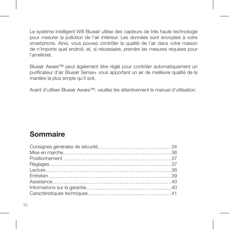 Blueair Aware™ User Manual English | Deutsch | Español | Français | Polski Le système intelligent Wifi Blueair utilise des capteurs de très haute technologie pour mesurer la pollution de l’air intérieur. Les données sont envoyées à votre smartphone. Ainsi, vous pouvez contrôler la qualité de l’air dans votre maison de n’importe quel endroit, et, si nécessaire, prendre les mesures requises pour l’améliorer. Blueair Aware™ peut également être réglé pour contrôler automatiquement un purificateur d’air Blueair Sense+ vous apportant un air de meilleure qualité de la manière la plus simple qu’il soit. Avant d’utiliser Blueair Aware™, veuillez lire attentivement le manuel d’utilisation. Sommaire Consignes générales de sécurité Mise en marche Positionnement Réglages Lecture Entretien Assistance Informations sur la garantie Caractéristiques techniques
