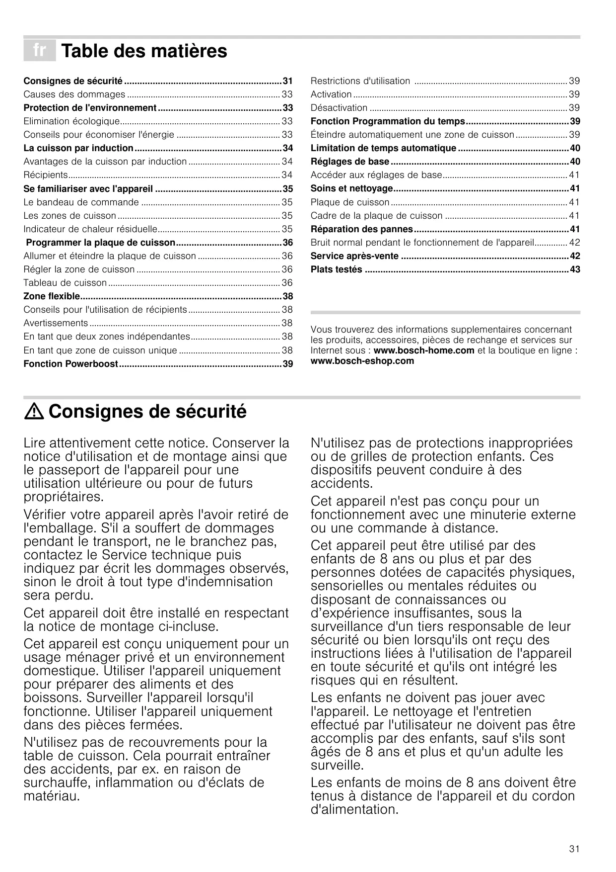 - Plats testés Produktinfo Vous trouverez des informations supplementaires concernant les produits, accessoires, pièces de rechange et services sur Internet sous : www.bosch-home.com et la boutique en ligne : www.bosch-eshop.com : Consignes de sécurité Lire attentivement cette notice. Conserver la notice d'utilisation et de montage ainsi que le passeport de l'appareil pour une utilisation ultérieure ou pour de futurs propriétaires. Vérifier votre appareil après l'avoir retiré de l'emballage. S'il a souffert de dommages pendant le transport, ne le branchez pas, contactez le Service technique puis indiquez par écrit les dommages observés, sinon le droit à tout type d'indemnisation sera perdu. Cet appareil doit être installé en respectant la notice de montage ci-incluse. Cet appareil est conçu uniquement pour un usage ménager privé et un environnement domestique. Utiliser l'appareil uniquement pour préparer des aliments et des boissons. Surveiller l'appareil lorsqu'il fonctionne. Utiliser l'appareil uniquement dans des pièces fermées. N'utilisez pas de recouvrements pour la table de cuisson. Cela pourrait entraîner des accidents, par ex. en raison de surchauffe, inflammation ou d'éclats de matériau. N'utilisez pas de protections inappropriées ou de grilles de protection enfants. Ces dispositifs peuvent conduire à des accidents. Cet appareil n'est pas conçu pour un fonctionnement avec une minuterie externe ou une commande à distance. Cet appareil peut être utilisé par des enfants de 8 ans ou plus et par des personnes dotées de capacités physiques, sensorielles ou mentales réduites ou disposant de connaissances ou d’expérience insuffisantes, sous la surveillance d'un tiers responsable de leur sécurité ou bien lorsqu'ils ont reçu des instructions liées à l'utilisation de l'appareil en toute sécurité et qu'ils ont intégré les risques qui en résultent. Les enfants ne doivent pas jouer avec l'appareil. Le nettoyage et l'entretien effectué par l'utilisateur ne doivent pas être accomplis par des enfants, sauf s'ils sont âgés de 8 ans et plus et qu'un adulte les surveille. Les enfants de moins de 8 ans doivent être tenus à distance de l'appareil et du cordon d'alimentation. p. 43