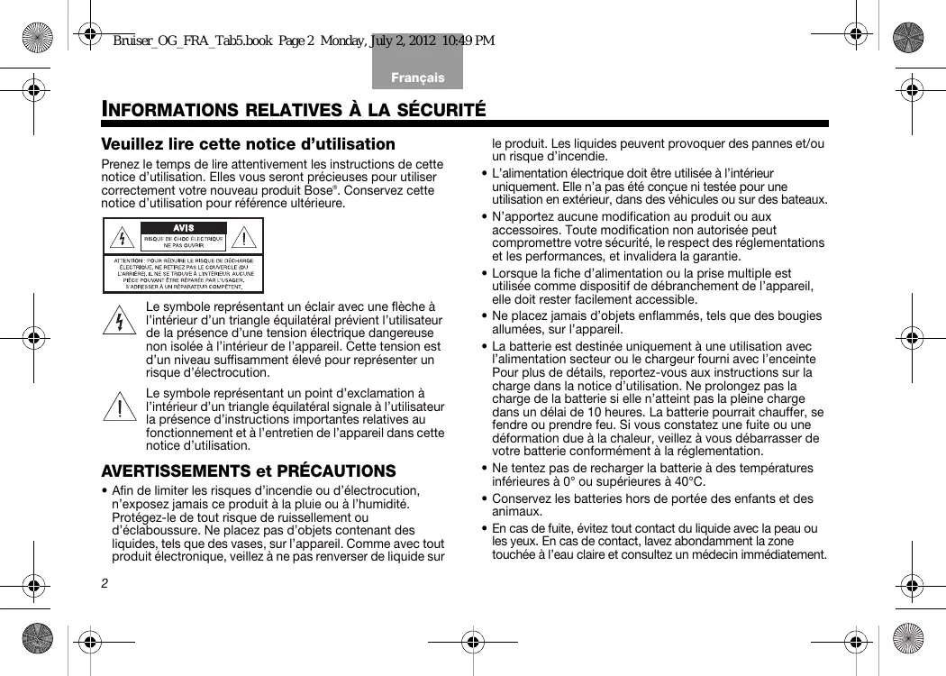 • La durée d’utilisation sur batterie devient très réduite. Pour vous procurer une batterie de rechange, contactez la filiale Bose de votre pays ou zone géographique. Consultez la page http://global.Bose.com pour trouver l’adresse adéquate. Bruiser_OG_FRA_Tab5.book Page 23 Monday, July 2, 2012 10:49 PM English Tab 2, 10 Français Tab 4, 12 Français Tab 6, 14 Tab 7, 15 Tab 8, 16 ENTRETIEN Nettoyage Pour nettoyer les surfaces externes de l’appareil, utilisez un chiffon doux et sec.