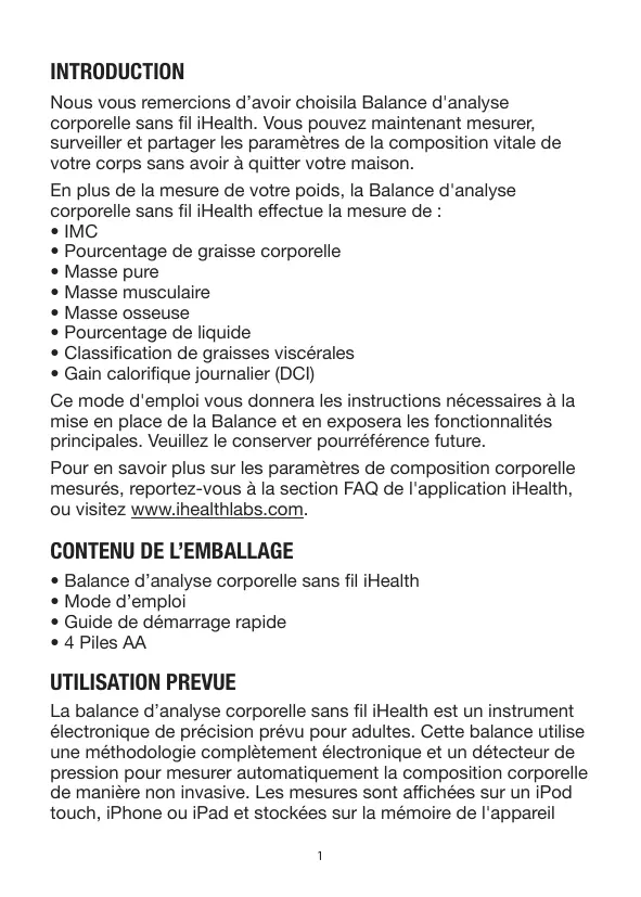 INTRODUCTION Nous vous remercions d’avoir choisila Balance d'analyse corporelle sans fil iHealth. Vous pouvez maintenant mesurer, surveiller et partager les paramètres de la composition vitale de votre corps sans avoir à quitter votre maison. En plus de la mesure de votre poids, la Balance d'analyse corporelle sans fil iHealth effectue la mesure de :