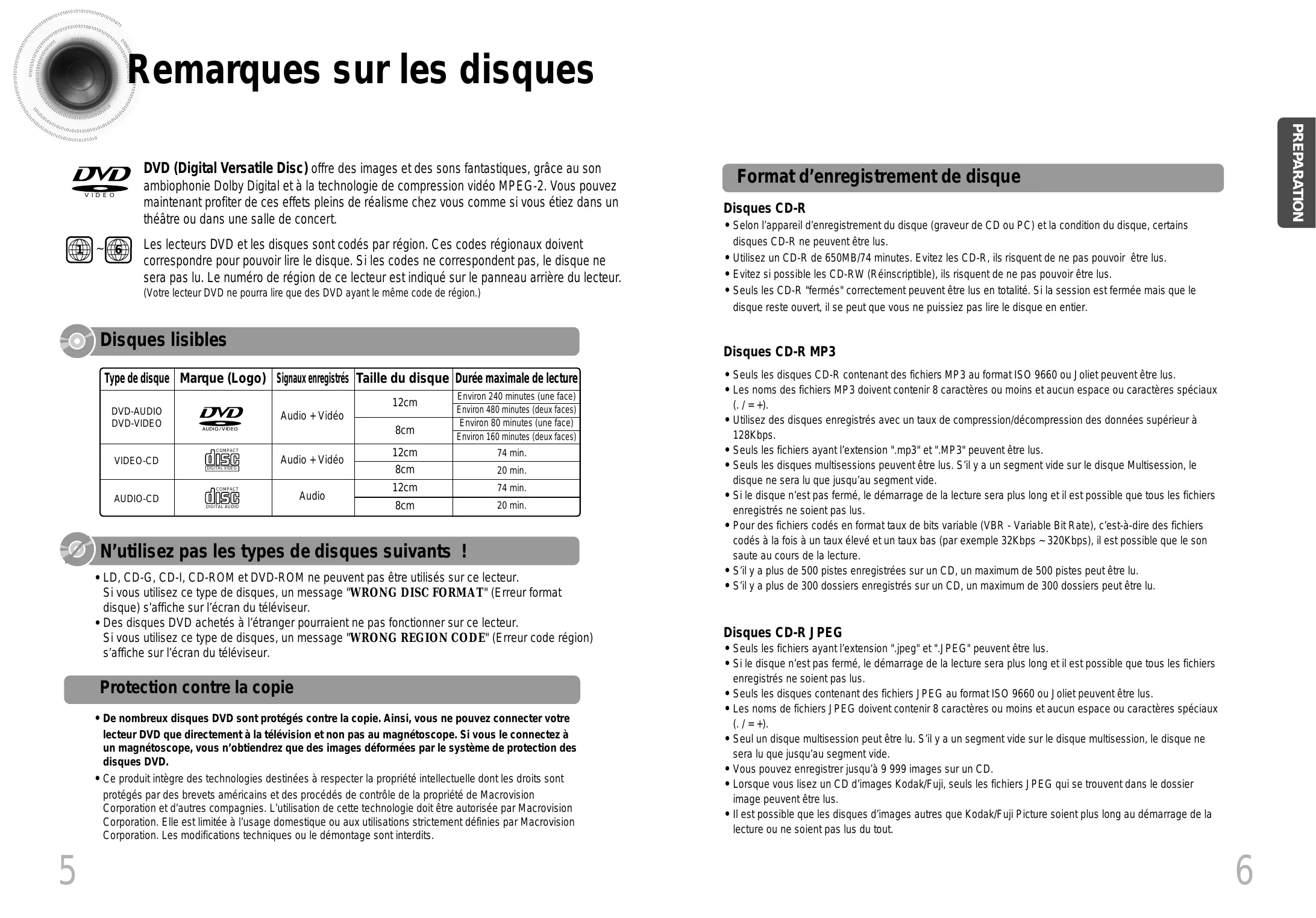 Condensation: Si vous appareil et/ou des disques ont passé un certain temps dans une température ambiente froide, par ex. pendant un transport en hiver, attendez environ 2 heures qu'ils aient atteint la température ambiente afin d'éviter des dégats sérieux.