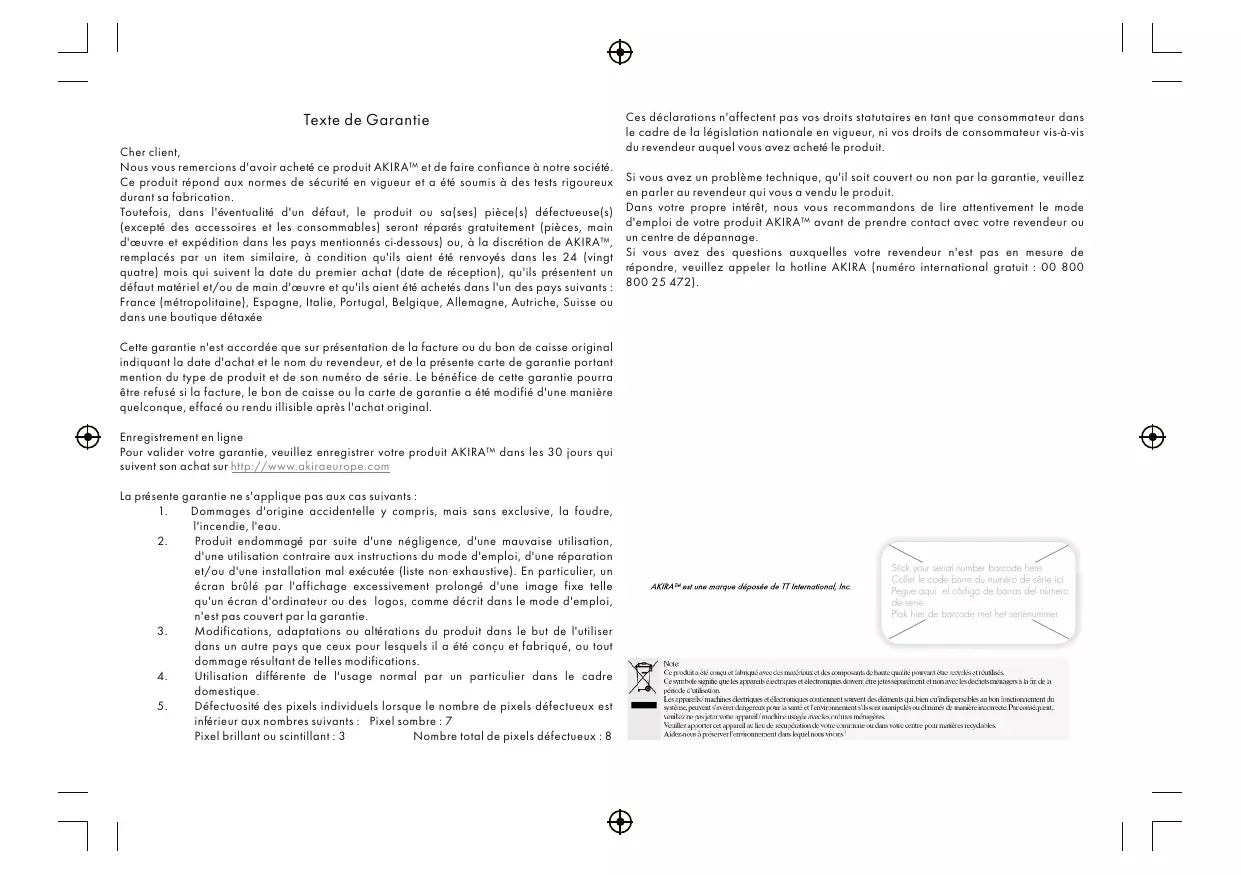 Texte de Garantie Cher client, Nous vous remercions d'avoir acheté ce produit AKIRA™ et de faire confiance à notre société. Ce produit répond aux normes de sécurité en vigueur et a été soumis à des tests rigoureux durant sa fabrication. Toutefois, dans l'éventualité d'un défaut, le produit ou sa(ses) pièce(s) défectueuse(s) (excepté des accessoires et les consommables) seront réparés gratuitement (pièces, main d'œuvre et expédition dans les pays mentionnés ci-dessous) ou, à la discrétion de AKIRA™, remplacés par un item similaire, à condition qu'ils aient été renvoyés dans les 24 (vingt quatre) mois qui suivent la date du premier achat (date de réception), qu'ils présentent un défaut matériel et/ou de main d'œuvre et qu'ils aient été achetés dans l'un des pays suivants : France (métropolitaine), Espagne, Italie, Portugal, Belgique, Allemagne, Autriche, Suisse ou dans une boutique détaxée Cette garantie n'est accordée que sur présentation de la facture ou du bon de caisse original indiquant la date d'achat et le nom du revendeur, et de la présente carte de garantie portant mention du type de produit et de son numéro de série. Le bénéfice de cette garantie pourra être refusé si la facture, le bon de caisse ou la carte de garantie a été modifié d'une manière quelconque, effacé ou rendu illisible après l'achat original. Enregistrement en ligne Pour valider votre garantie, veuillez enregistrer votre produit AKIRA™ dans les 30 jours qui suivent son achat sur http://www.akiraeurope.com La présente garantie ne s'applique pas aux cas suivants : Dommages d'origine accidentelle y compris, mais sans exclusive, la foudre, l'incendie, l'eau. Produit endommagé par suite d'une négligence, d'une mauvaise utilisation, d'une utilisation contraire aux instructions du mode d'emploi, d'une réparation et/ou d'une installation mal exécutée (liste non exhaustive). En particulier, un écran brûlé par l'affichage excessivement prolongé d'une image fixe telle qu'un écran d'ordinateur ou des logos, comme décrit dans le mode d'emploi, n'est pas couvert par la garantie. Modifications, adaptations ou altérations du produit dans le but de l'utiliser dans un autre pays que ceux pour lesquels il a été conçu et fabriqué, ou tout dommage résultant de telles modifications. Utilisation différente de l'usage normal par un particulier dans le cadre domestique. Défectuosité des pixels individuels lorsque le nombre de pixels défectueux est inférieur aux nombres suivants : Pixel sombre : 7 Pixel brillant ou scintillant : 3 Nombre total de pixels défectueux : 8 Ces déclarations n'affectent pas vos droits statutaires en tant que consommateur dans le cadre de la législation nationale en vigueur, ni vos droits de consommateur vis-à-vis du revendeur auquel vous avez acheté le produit. Si vous avez un problème technique, qu'il soit couvert ou non par la garantie, veuillez en parler au revendeur qui vous a vendu le produit. Dans votre propre intérêt, nous vous recommandons de lire attentivement le mode d'emploi de votre produit AKIRA™ avant de prendre contact avec votre revendeur ou un centre de dépannage. Si vous avez des questions auxquelles votre revendeur n'est pas en mesure de répondre, veuillez appeler la hotline AKIRA (numéro international gratuit : 00 800 800 25 472). Instructions de sécurité importantes