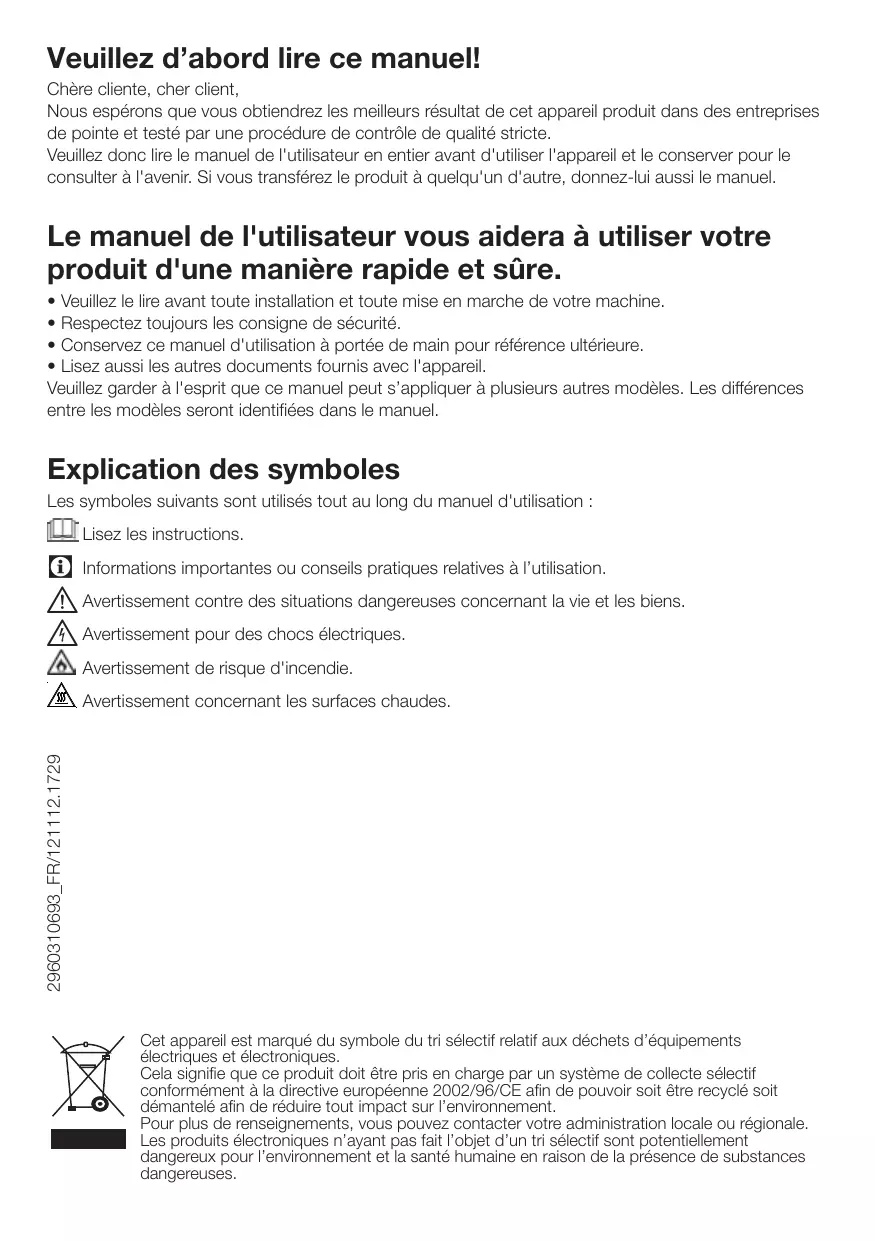 Veuillez donc dire le manuel de l'utilisateur en entier avant d'utiliser l'appareil et le conserver pour le consulter à l'avir. Si vous transférez le produit à quelqu'un d'autre, donnez-lui aussi le manuel.