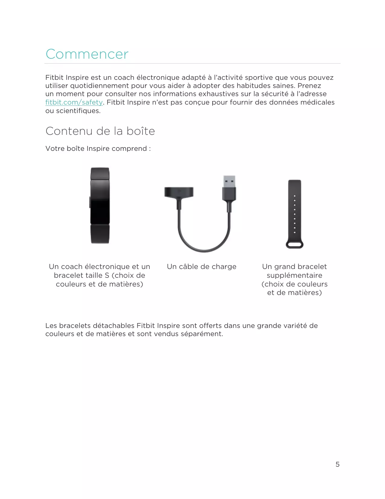 Commencer Fitbit Inspire est un coach électronique adapté à l’activité sportive que vous pouvez utiliser quotidiennement pour vous aider à adopter des habitudes saines. Prenez un moment pour consulter nos informations exhaustives sur la sécurité à l’adresse fitbit.com/safety. Fitbit Inspire n’est pas conçue pour fournir des données médicales ou scientifiques. Contenu de la boîte Votre boîte Inspire comprend : Un coach électronique et un bracelet taille S (choix de couleurs et de matières) Un câble de charge Un grand bracelet supplémentaire (choix de couleurs et de matières) Les bracelets détachables Fitbit Inspire sont offerts dans une grande variété de couleurs et de matières et sont vendus séparément.