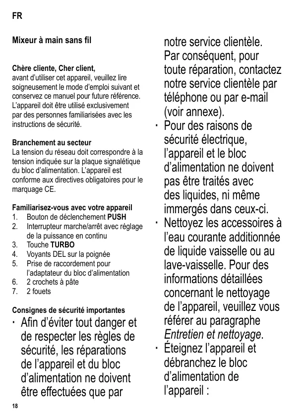 Branchement au secteur La tension du réseau doit correspondre à la tension indiquée sur la plaque signalétique du bloc d’alimentation. L’appareil est conforme aux directives obligatoires pour le marquage CE. Familiarisez-vous avec votre appareil 1. Bouton de déclenchement PUSH 2. Interrupteur marche/arrêt avec réglage de la puissance en continu 3. Touche TURBO 4. Voyants DEL sur la poignée 5. Prise de raccordement pour l’adaptateur du bloc d’alimentation 6. 2 crochets à pâte 7. 2 fouets Consignes de sécurité importantes