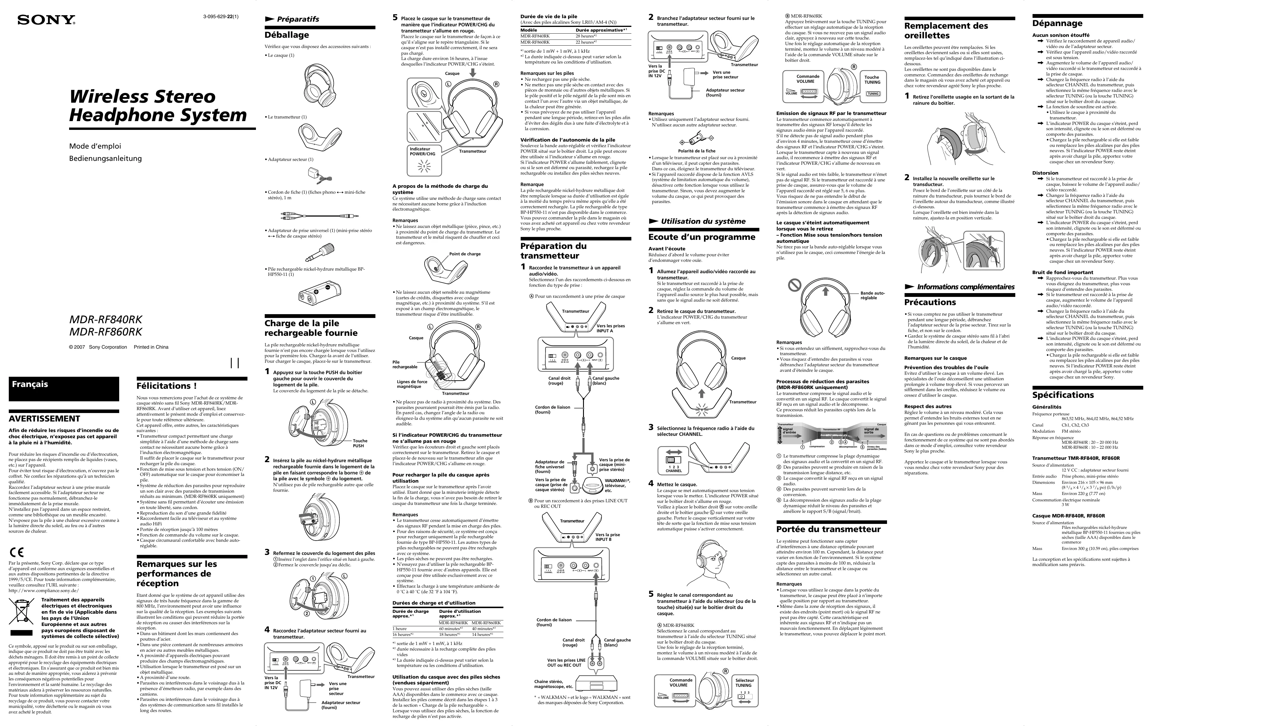 - Pile rechargeable nickel-hydrure métallique BPHP550-11 (1) Soulevez la bande auto-réglable et vérifiez l’indicateur POWER situé sur le boîtier droit. La pile peut encore être utilisée si l’indicateur s’allume en rouge. Si l’indicateur POWER s’allume faiblement, clignote ou si le son est déformé ou parasité, rechargez la pile rechargeable ou installez des piles sèches neuves. Remarque La pile rechargeable nickel-hydrure métallique doit être remplacée lorsque sa durée d’utilisation est égale à la moitié du temps prévu même après qu’elle a été correctement rechargée. La pile rechargeable de type BP-HP550-11 n’est pas disponible dans le commerce. Vous pouvez commander la pile dans le magasin où vous avez acheté cet appareil ou chez votre revendeur Sony le plus proche. Commande VOLUME Adaptateur secteur (fourni) audio/vidéo. MDR-RF840RK MDR-RF860RK © 2007 Sony Corporation Printed in China Charge de la pile rechargeable fournie La pile rechargeable nickel-hydrure métallique fournie n’est pas encore chargée lorsque vous l’utilisez pour la première fois. Chargez-la avant de l’utiliser. Pour charger le casque, placez-le sur le transmetteur.
