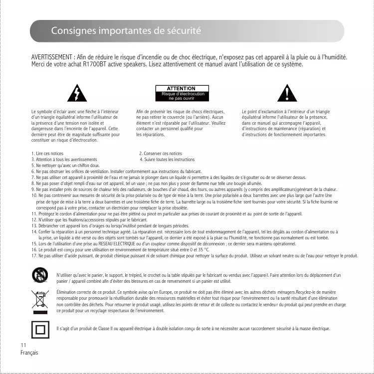 English Consignes importantes de sécurité AVERTISSEMENT : Afin de réduire le risque d’incendie ou de choc électrique, n'exposez pas cet appareil à la pluie ou à l’humidité. Merci de votre achat R1700BT active speakers. Lisez attentivement ce manuel avant l’utilisation de ce système. Risque d’électrocution ne pas ouvrir Le symbole d’éclair avec une flèche à l’intérieur d’un triangle équilatéral informe l’utilisateur de la présence d’une tension non isolée et dangereuse dans l’enceinte de l’appareil. Cette dernière peut être de magnitude suffisante pour constituer un risque d’électrocution. Afin de prévenir les risque de chocs électriques, ne pas retirer le couvercle (ou l’arrière). Aucun élément n’est réparable par l’utilisateur. Veuillez contacter un personnel qualifié pour les réparations. Le point d’exclamation à l’intérieur d’un triangle équilatéral informe l’utilisateur de la présence, dans ce manuel qui accompagne l’appareil, d’instructions de maintenance (réparation) et d’instructions de fonctionnement importantes.