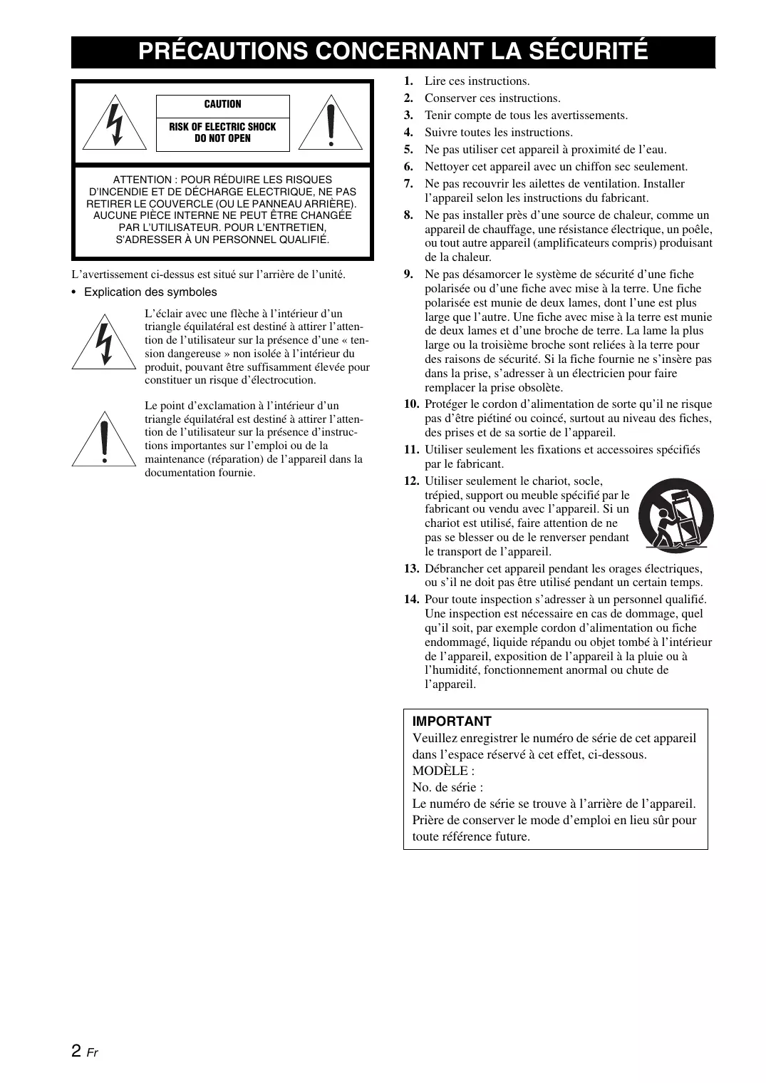 Lire ces instructions. Conserver ces instructions. Tenir compte de tous les avertissements. Suivre toutes les instructions. Ne pas utiliser cet appareil à proximité de l’eau. Nettoyer cet appareil avec un chiffon sec seulement. Ne pas recouvrir les ailettes de ventilation. Installer l’appareil selon les instructions du fabricant. Ne pas installer près d’une source de chaleur, comme un appareil de chauffage, une résistance électrique, un poêle, ou tout autre appareil (amplificateurs compris) produisant de la chaleur. Ne pas désamorcer le système de sécurité d’une fiche polarisée ou d’une fiche avec mise à la terre. Une fiche polarisée est munie de deux lames, dont l’une est plus large que l’autre. Une fiche avec mise à la terre est munie de deux lames et d’une broche de terre. La lame la plus large ou la troisième broche sont reliées à la terre pour des raisons de sécurité. Si la fiche fournie ne s’insère pas dans la prise, s’adresser à un électricien pour faire remplacer la prise obsolète. Protéger le cordon d’alimentation de sorte qu’il ne risque pas d’être piétiné ou coincé, surtout au niveau des fiches, des prises et de sa sortie de l’appareil. Utiliser seulement les fixations et accessoires spécifiés par le fabricant. Utiliser seulement le chariot, socle, trépied, support ou meuble spécifié par le fabricant ou vendu avec l’appareil. Si un chariot est utilisé, faire attention de ne pas se blesser ou de le renverser pendant le transport de l’appareil. Débrancher cet appareil pendant les orages électriques, ou s’il ne doit pas être utilisé pendant un certain temps. Pour toute inspection s’adresser à un personnel qualifié. Une inspection est nécessaire en cas de dommage, quel qu’il soit, par exemple cordon d’alimentation ou fiche endommagé, liquide répandu ou objet tombé à l’intérieur de l’appareil, exposition de l’appareil à la pluie ou à l’humidité, fonctionnement anormal ou chute de l’appareil. IMPORTANT Veuillez enregistrer le numéro de série de cet appareil dans l’espace réservé à cet effet, ci-dessous. MODÈLE : No. de série : Le numéro de série se trouve à l’arrière de l’appareil. Prière de conserver le mode d’emploi en lieu sûr pour toute référence future. 2 Fr Cet équipement est conforme aux limites d’exposition aux rayonnements énoncées pour un environnement non contrôlé et respecte les règles les radioélectriques (RF) de la FCC lignes directrices d’exposition et d’exposition aux fréquences radioélectriques (RF) CNR-102 de l’IC. Cet équipement doit être installé et utilisé en gardant une distance de 20 cm ou plus entre le dispositif rayonnant et le corps humain. Français Le présent appareil est conforme aux la partie 15 des règles de la FCC et CNR d’Industrie Canada applicables aux appareils radio exempts de licence. L’exploitation est autorisée aux deux conditions suivantes : (1) l’appareil ne doit pas produire de brouillage, et (2) l’utilisateur de l’appareil doit accepter tout brouillage radioélectrique subi, même si le brouillage est susceptible d’en compromettre le fonctionnement. Ce émetteur ne peut pas être placé à proximité de ou utilisé conjointement avec tout autre émetteur ou antenne. (pour le Canada) Pour une utilisation en intérieur uniquement. CAN ICES-3 (B)/NMB-3(B) (can_b_02) 3 Fr PRÉCAUTIONS