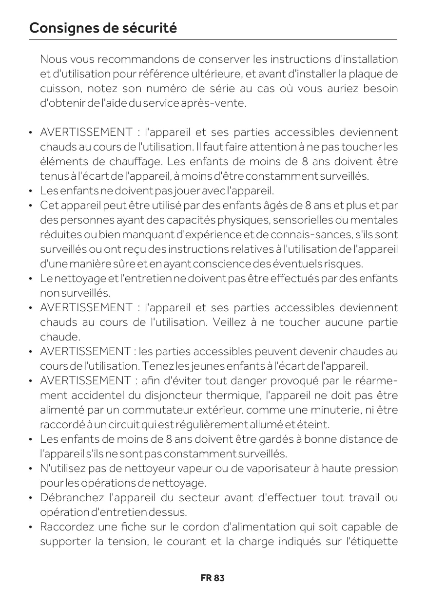- AVERTISSEMENT : l'appareil et ses parties accessibles deviennent chauds au cours de l'utilisation. Il faut faire attention à ne pas toucher les éléments de chauffage. Les enfants de moins de 8 ans doivent être tenus à l'écart de l'appareil, à moins d'être constamment surveillés.