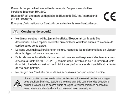 Prenez le temps de lire l’intégralité de ce mode d’emploi avant d’utiliser l’oreillette Bluetooth HM3500. Bluetooth® est une marque déposée de Bluetooth SIG, Inc. international QD ID : B016579 Pour plus d’informations sur Bluetooth, consultez le site www.bluetooth.com. Consignes de sécurité
