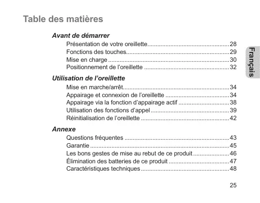 - Français Présentation de votre oreillette p. 28
