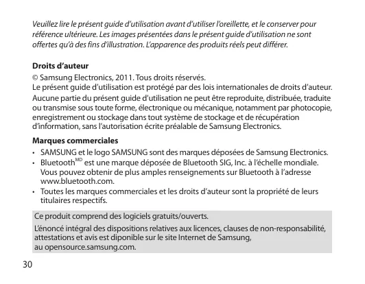 Veuillez lire le présent guide d’utilisation avant d’utiliser l’oreillette, et le conserver pour référence ultérieure. Les images présentées dans le présent guide d’utilisation ne sont offertes qu’à des fins d’illustration. L’apparence des produits réels peut différer. Droits d’auteur © Samsung Electronics, 2011. Tous droits réservés. Le présent guide d’utilisation est protégé par des lois internationales de droits d’auteur. Aucune partie du présent guide d’utilisation ne peut être reproduite, distribuée, traduite ou transmise sous toute forme, électronique ou mécanique, notamment par photocopie, enregistrement ou stockage dans tout système de stockage et de récupération d’information, sans l’autorisation écrite préalable de Samsung Electronics. Marques commerciales