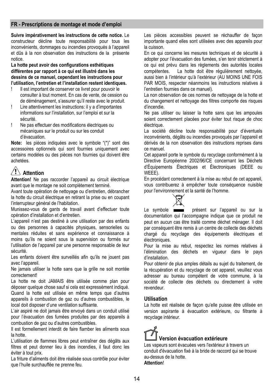 Il est important de conserver ce livre pour pouvoir le consulter à tout moment. En cas de vente, de cession ou de déménagement, s'assurer qu'il reste avec le produit. Lire attentivement les instructions: il y a d'importantes informations sur l'installation, sur l'emploi et sur la sécurité. Ne pas effectuer des modifications électriques ou mécaniques sur le produit ou sur les conduits d'évacuation.