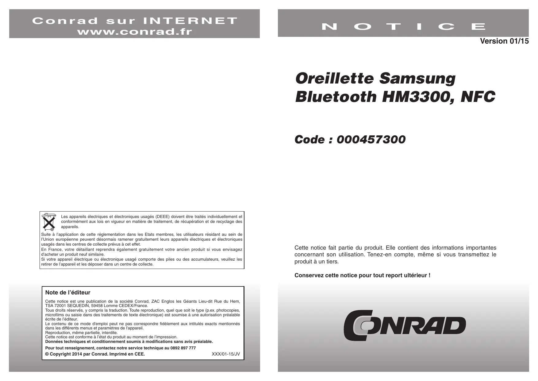 Conrad sur INTERNET Www.conrad.fr Les appareils électriques et électroniques usagés (DEEE) doivent être traités individuellement et conformément aux lois en vigueur en matière de traitement, de récupération et de recyclage des appareils. Suite à l'application de cette réglementation dans les Etats membres, les uti l'Union européenne peuvent désormais ramener gratuitement leurs apparei usagés dans les centres de collecte prévus à cet effet. En France, votre détaillant reprendra également gratuitement votre ancien produit si vous envisagez d'acheter un produit neuf similaire. Si votre appareil électrique ou électronique usagé comporte des piles ou des accumulateurs, veuillez les: retirer de l'appareil et les déposer dans un centre de collecte. ateurs résidant au sein de électriques et électroniques Note de l’éditeur Cette notice est une publication de la société Conrad, ZAC Englos les Géants Lieu-dit Rue du Hem, TSA 72001 SEQUEDIN, 59458 Lomme CEDEX/France. Tous droits réservés, y compris la traduction. Toute reproduction, quel que soit le type (p.ex. photocopies, microfims ou saisie dans des traitements de texte électronique) est soumise à une autorisation préalable écrite de l'éditeur. Le contenu de ce mode d'emploi peut ne pas correspondre fidèlement aux intitulés exacts mentionnés dans les différents menus et paramètres de l'apparei Reproduction, même partielle, interdite. Cette notice est conforme à l'état du produit au moment de l'impression. Données techniques et conditionnement soumis à modifications sans avis préalable. Pour tout renseignement, contactez notre service technique au 0892 897 777 © Copyright 2014 par Conrad. Imprimé en CEE. XXUO 1-15 IN OS TT CI [e= EE Version 01/15 Oreillette Samsung Bluetooth HM3300, NFC Code : 000457300 Cette notice fait partie du produit. Elle contient des informations importantes concernant son utilisation. Tenez-en compte, même si vous transmettez le produit à un tiers. Conservez cette notice pour tout report ultérieur !