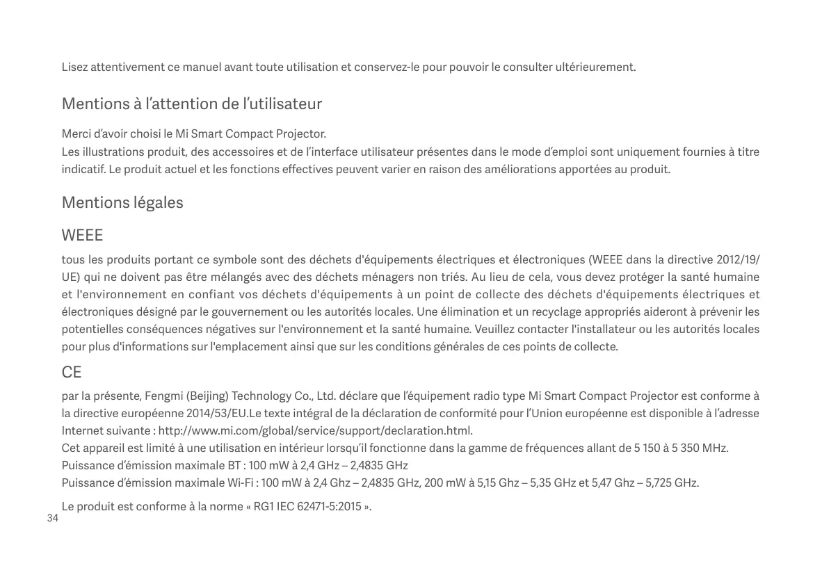 par la présente, Fengmi (Beijing) Technology Co., Ltd. déclare que l’équipement radio type Mi Smart Compact Projector est conforme à la directive européenne 2014/53/EU.Le texte intégral de la déclaration de conformité pour l’Union européenne est disponible à l’adresse Internet suivante : http://www.mi.com/global/service/support/declaration.html. Cet appareil est limité à une utilisation en intérieur lorsqu’il fonctionne dans la gamme de fréquences allant de 5 150 à 5 350 MHz. Puissance d’émission maximale BT : 100 mW à 2,4 GHz – 2,4835 GHz Puissance d’émission maximale Wi-Fi : 100 mW à 2,4 Ghz – 2,4835 GHz, 200 mW à 5,15 Ghz – 5,35 GHz et 5,47 Ghz – 5,725 GHz.