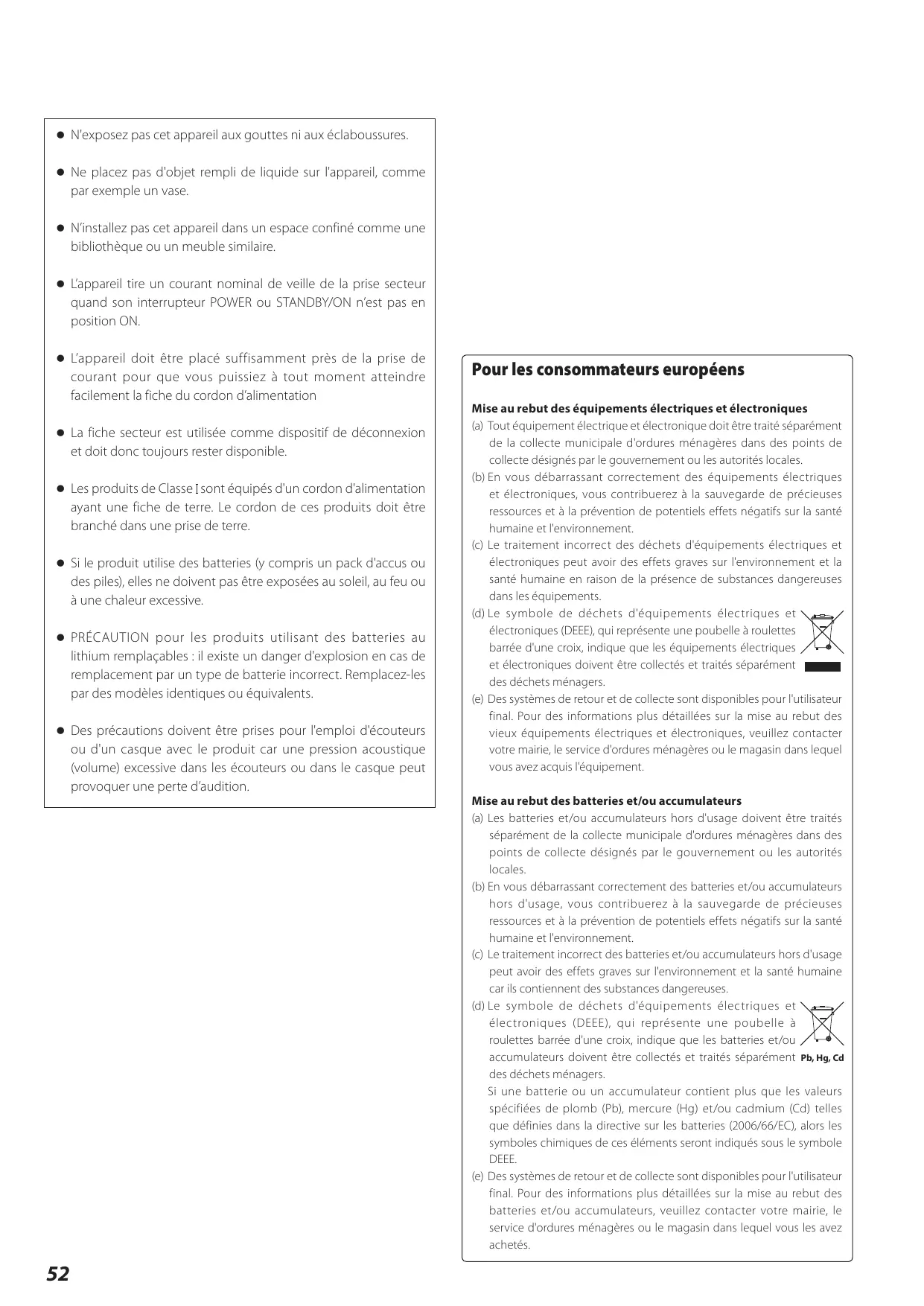 Mise au rebut des équipements électriques et électroniques (a) Tout équipement électrique et électronique doit être traité séparément de la collecte municipale d'ordures ménagères dans des points de collecte désignés par le gouvernement ou les autorités locales. (b) En vous débarrassant correctement des équipements électriques et électroniques, vous contribuerez à la sauvegarde de précieuses ressources et à la prévention de potentiels effets négatifs sur la santé humaine et l'environnement. (c) Le traitement incorrect des déchets d'équipements électriques et électroniques peut avoir des effets graves sur l'environnement et la santé humaine en raison de la présence de substances dangereuses dans les équipements. (d) Le symbole de déchets d'équipements électriques et électroniques (DEEE), qui représente une poubelle à roulettes barrée d'une croix, indique que les équipements électriques et électroniques doivent être collectés et traités séparément des déchets ménagers. (e) Des systèmes de retour et de collecte sont disponibles pour l'utilisateur final. Pour des informations plus détaillées sur la mise au rebut des vieux équipements électriques et électroniques, veuillez contacter votre mairie, le service d'ordures ménagères ou le magasin dans lequel vous avez acquis l'équipement. Mise au rebut des batteries et/ou accumulateurs (a) Les batteries et/ou accumulateurs hors d'usage doivent être traités séparément de la collecte municipale d'ordures ménagères dans des points de collecte désignés par le gouvernement ou les autorités locales. (b) En vous débarrassant correctement des batteries et/ou accumulateurs hors d'usage, vous contribuerez à la sauvegarde de précieuses ressources et à la prévention de potentiels effets négatifs sur la santé humaine et l'environnement. (c) Le traitement incorrect des batteries et/ou accumulateurs hors d'usage peut avoir des effets graves sur l'environnement et la santé humaine car ils contiennent des substances dangereuses. (d) Le symbole de déchets d'équipements électriques et électroniques (DEEE), qui représente une poubelle à roulettes barrée d'une croix, indique que les batteries et/ou accumulateurs doivent être collectés et traités séparément Pb, Hg, Cd des déchets ménagers. Si une batterie ou un accumulateur contient plus que les valeurs spécifiées de plomb (Pb), mercure (Hg) et/ou cadmium (Cd) telles que définies dans la directive sur les batteries (2006/66/EC), alors les symboles chimiques de ces éléments seront indiqués sous le symbole DEEE. (e) Des systèmes de retour et de collecte sont disponibles pour l'utilisateur final. Pour des informations plus détaillées sur la mise au rebut des batteries et/ou accumulateurs, veuillez contacter votre mairie, le service d'ordures ménagères ou le magasin dans lequel vous les avez achetés.