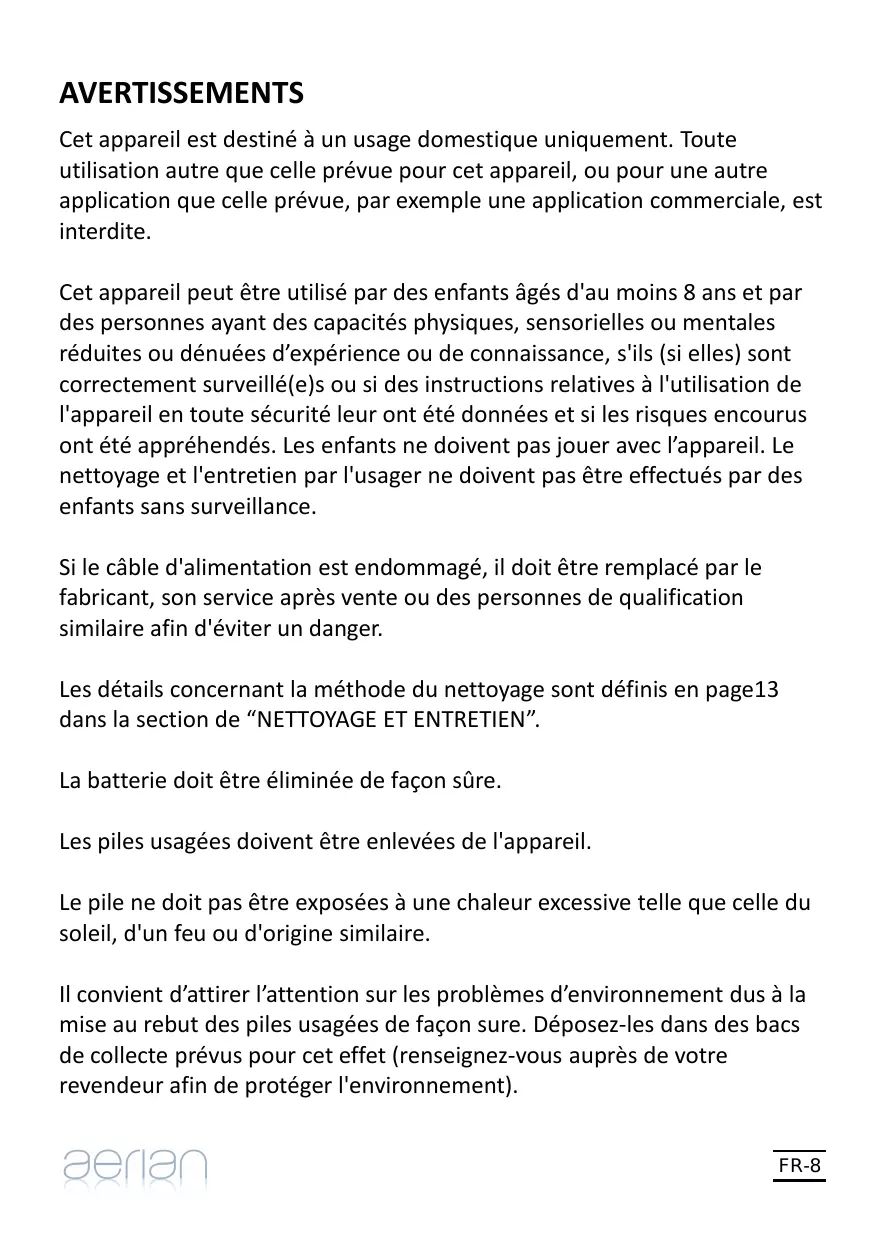 AFT2 AVERTISSEMENTS Cet appareil est destiné à un usage domestique uniquement. Toute utilisation autre que celle prévue pour cet appareil, ou pour une autre application que celle prévue, par exemple une application commerciale, est interdite. Cet appareil peut être utilisé par des enfants âgés d'au moins 8 ans et par des personnes ayant des capacités physiques, sensorielles ou mentales réduites ou dénuées d’expérience ou de connaissance, s'ils (si elles) sont correctement surveillé(e)s ou si des instructions relatives à l'utilisation de l'appareil en toute sécurité leur ont été données et si les risques encourus ont été appréhendés. Les enfants ne doivent pas jouer avec l’appareil. Le nettoyage et l'entretien par l'usager ne doivent pas être effectués par des enfants sans surveillance. Si le câble d'alimentation est endommagé, il doit être remplacé par le fabricant, son service après vente ou des personnes de qualification similaire afin d'éviter un danger. Les détails concernant la méthode du nettoyage sont définis en page13 dans la section de “NETTOYAGE ET ENTRETIEN”. La batterie doit être éliminée de façon sûre. Les piles usagées doivent être enlevées de l'appareil. Le pile ne doit pas être exposées à une chaleur excessive telle que celle du soleil, d'un feu ou d'origine similaire. Il convient d’attirer l’attention sur les problèmes d’environnement dus à la mise au rebut des piles usagées de façon sure. Déposez-les dans des bacs de collecte prévus pour cet effet (renseignez-vous auprès de votre revendeur afin de protéger l'environnement). FR-8