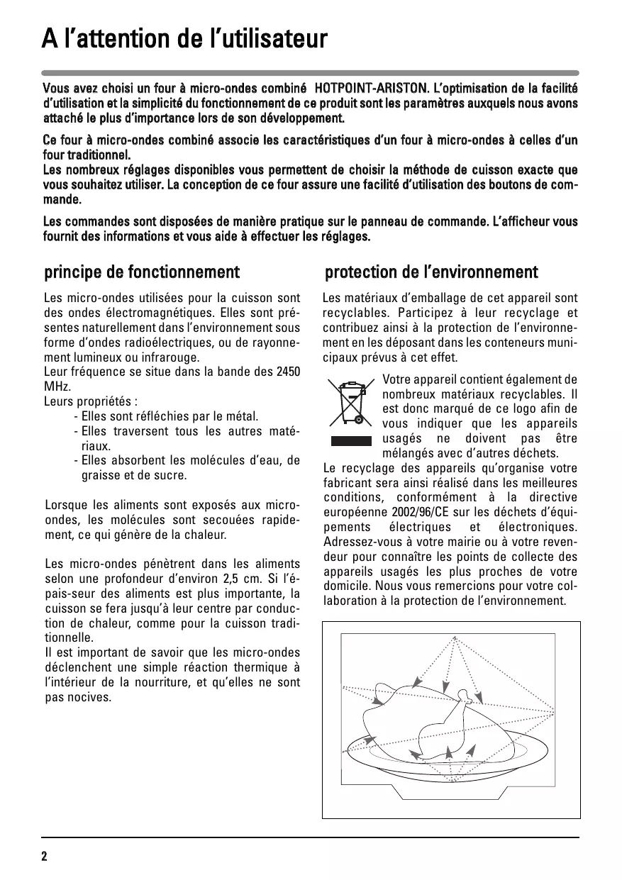 A l’attention de l’utilisateur Vous avez choisi un four à micro-ondes combiné HOTPOINT-ARISTON. L’optimisation de la facilité d’utilisation et la simplicité du fonctionnement de ce produit sont les paramètres auxquels nous avons attaché le plus d’importance lors de son développement. Ce four à micro-ondes combiné associe les caractéristiques d’un four à micro-ondes à celles d’un four traditionnel. Les nombreux réglages disponibles vous permettent de choisir la méthode de cuisson exacte que vous souhaitez utiliser. La conception de ce four assure une facilité d’utilisation des boutons de com mande. Les commandes sont disposées de manière pratique sur le panneau de commande. L’afficheur vous fournit des informations et vous aide à effectuer les réglages. principe de fonctionnement protection de l’environnement Les micro-ondes utilisées pour la cuisson sont des ondes électromagnétiques. Elles sont présentes naturellement dans l’environnement sous forme d’ondes radioélectriques, ou de rayonnement lumineux ou infrarouge. Leur fréquence se situe dans la bande des 2450 MHz. Leurs propriétés : - Elles sont réfléchies par le métal. - Elles traversent tous les autres matériaux. - Elles absorbent les molécules d’eau, de graisse et de sucre. Les matériaux d’emballage de cet appareil sont recyclables. Participez à leur recyclage et contribuez ainsi à la protection de l’environnement en les déposant dans les conteneurs municipaux prévus à cet effet. Lorsque les aliments sont exposés aux microondes, les molécules sont secouées rapidement, ce qui génère de la chaleur. Les micro-ondes pénètrent dans les aliments selon une profondeur d’environ 2,5 cm. Si l’épais-seur des aliments est plus importante, la cuisson se fera jusqu’à leur centre par conduction de chaleur, comme pour la cuisson traditionnelle. Il est important de savoir que les micro-ondes déclenchent une simple réaction thermique à l’intérieur de la nourriture, et qu’elles ne sont pas nocives.