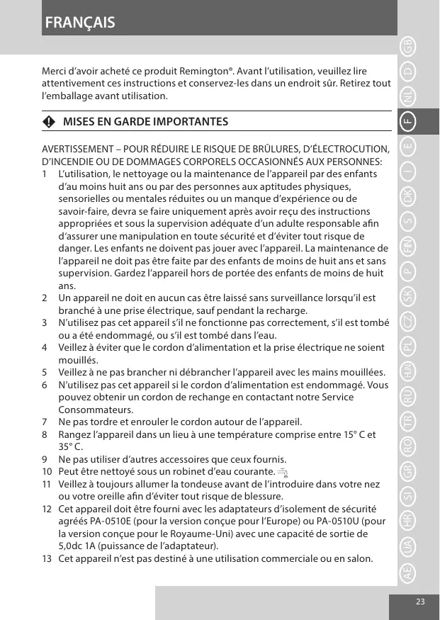 1 L'utilisation, le nettoyage ou la maintenance de l'appareil par des enfants d'au moins huit ans ou par des personnes aux aptitudes physiques, sensorielles ou mentales réduites ou un manque d'expérience ou de savoir-faire, devra se faire uniquement après avoir reçu des instructions appropriées et sous la supervision ajustée d'un adulte responsable afin d'assurer une manipulation en toute sécurité et d'éviter tout risque de danger. Les enfants ne doivent pas jouer avec l'appareil. La maintenance de l'appareil ne doit pas être faite par des enfants de moins de huit ans et sans supervision. Gardez l'appareil hors de portée des enfants de moins huit ans. 2 Un appareil ne doit en aucun cas être laissé sans surveillance lorsqu'il est branché à une prise électrique, sauf pendant la recharge. 3 N'utilisez pas cet appareil s'il ne fonctionne pas correctement, s'il est tombé ou a été endommagé, ou s'il est tombé dans l'eau. 4 Veillez à éviter que le cordon d'alimentation et la prise électrique ne soient mouillés. 5 Veillez à ne pas brancher ni débrancher l'appareil avec les mains mouillées. 6 N'utilisez pas cet appareil si le cordon d'alimentation est endommagé. Vous pouvez obtenir un cordon de rechange en contactant notre Service Consommateurs. 7 Ne pas tordre et enrouler le cordon autour de l'appareil. 8 Rangez l'appareil dans un lieu à une température comprise entre 15°C et 35°C. 9 Ne pas utiliser d'autres accessoires que ceux fournis. 10 Peut être nettoyé sous un robinet d'eau courante. 11 Veillez à toujours allumer la tondeuse avant de l'introduire dans votre nez ou votre oreille afin d'éviter tout risque de blessure. 12 Cet appareil doit être fourni avec les adaptateurs d'isolement de sécurité à la version où le Royaume-Uni a une capacité de sortie de 5,0dc 1A (puissance de l'adaptateur). 13 Cet appareil n'est pas destiné à une utilisation commerciale ou en salon.