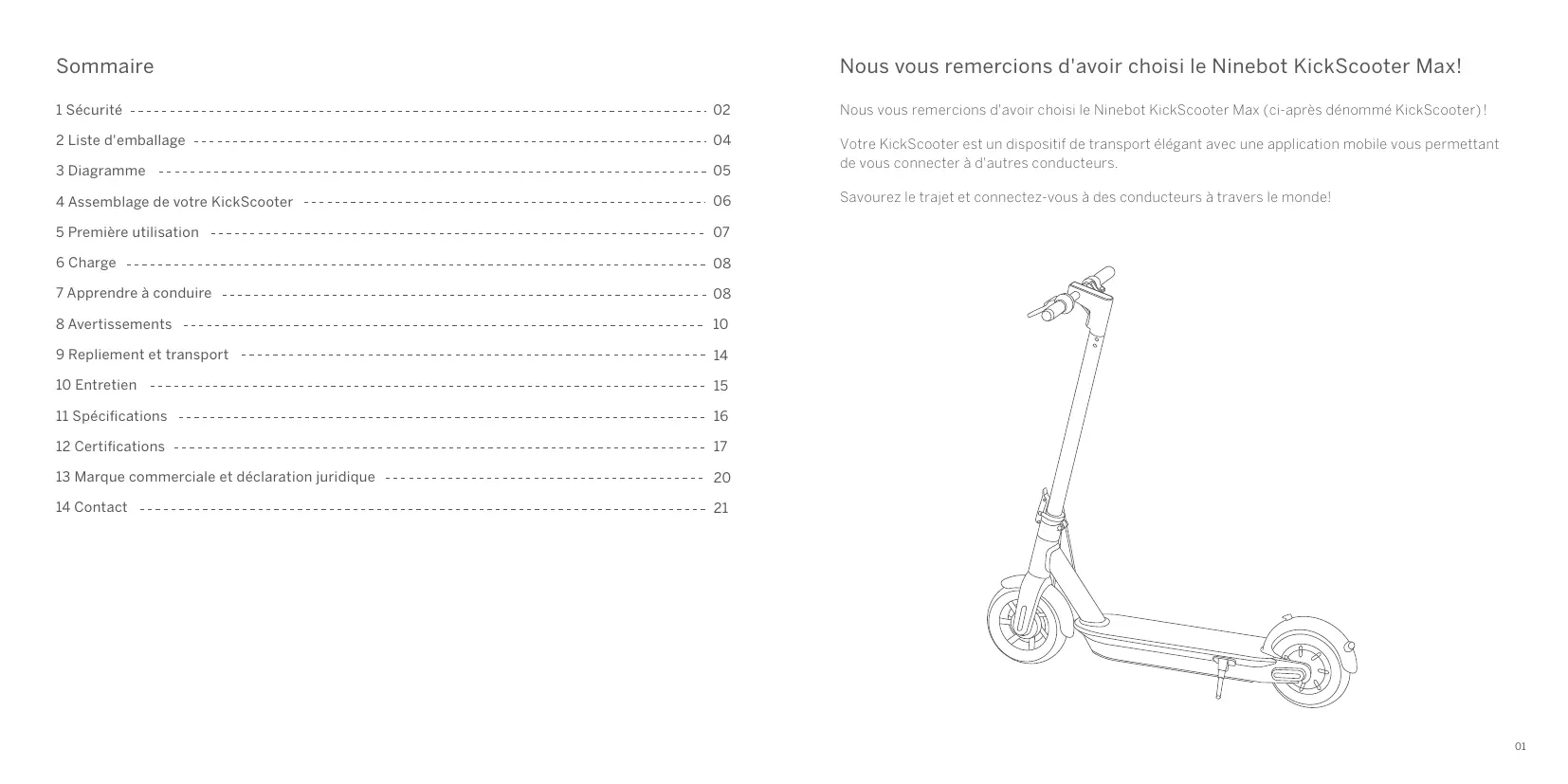 Le KickScooter est couvert par les brevets s'y afférent. Pour obtenir des informations sur les brevets, visitez http://www.segway.com. Nous avons tenté d’ inclure des descriptions et des instructions pour toutes les fonctions du KickScooter au moment de l’ impression. Cependant, en raison de l'amélioration constante des fonctionnalités de l'appareil et des modifications de conception, votre KickScooter peut différer légèrement de celui présenté dans ce document. Visitez l’ App Store d’ Apple (IOS) ou le Google Play Store (Android) pour télécharger et installer l’appli. Veuillez noter qu'il existe de multiples modèles Segway et Ninebot possédant des fonctionnalités différentes, et certaines des fonctionnalités mentionnées ici peuvent ne pas s'appliquer à votre unité. Le fabricant se réserve le droit de modifier l'apparence et la fonctionnalité du produit et de la documentation KickScooter sans préavis. © 2019 Ninebot (Beijing) Tech Co. Ltd. Tous droits réservés.
